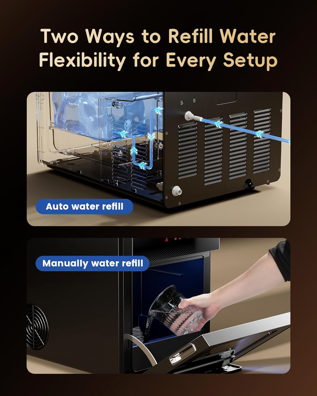 Easy Water Entry: Connect to a water line for endless ice without interruptions saving time and effort. Or use the 0.45-gallon built-in tank for flexibility. Plus the bottom drain design allows easy water removal when placed on a countertop
