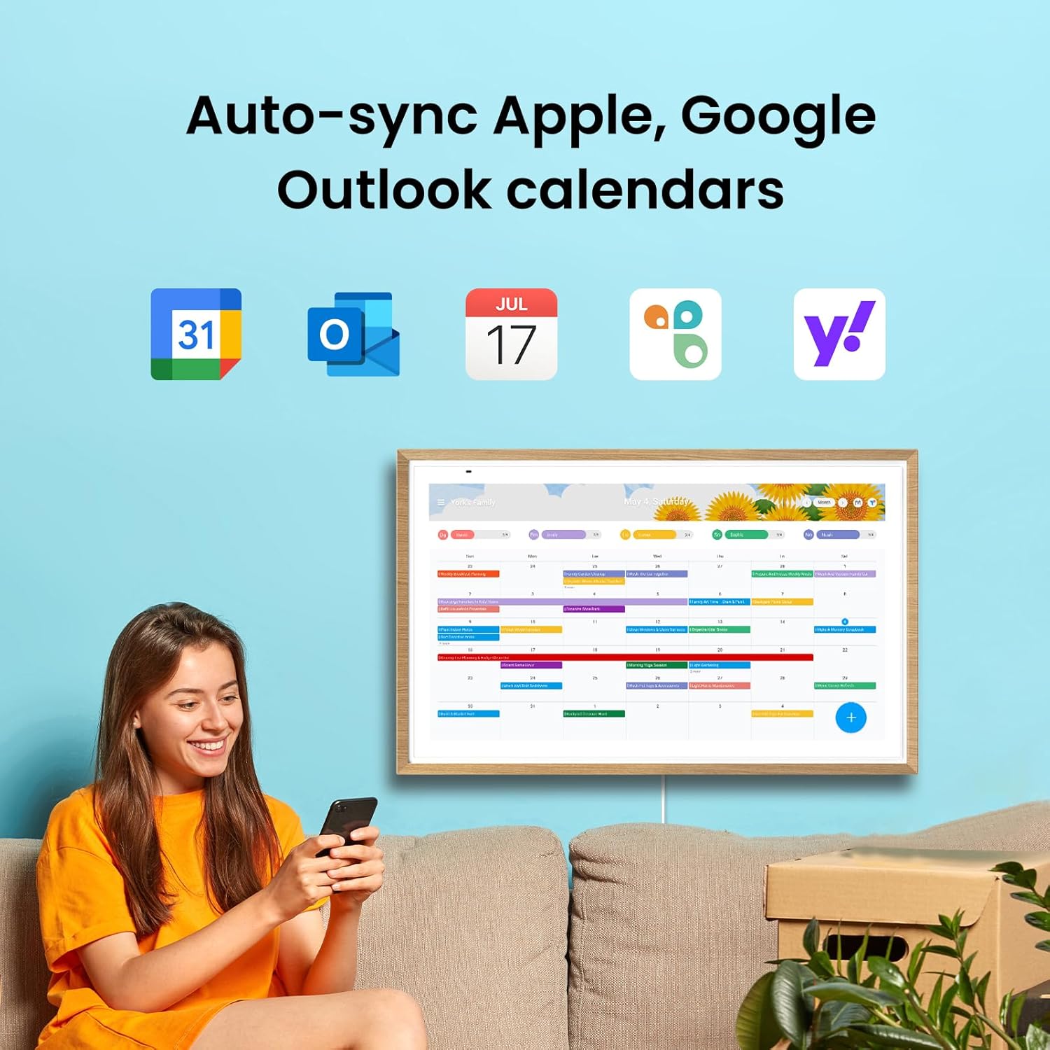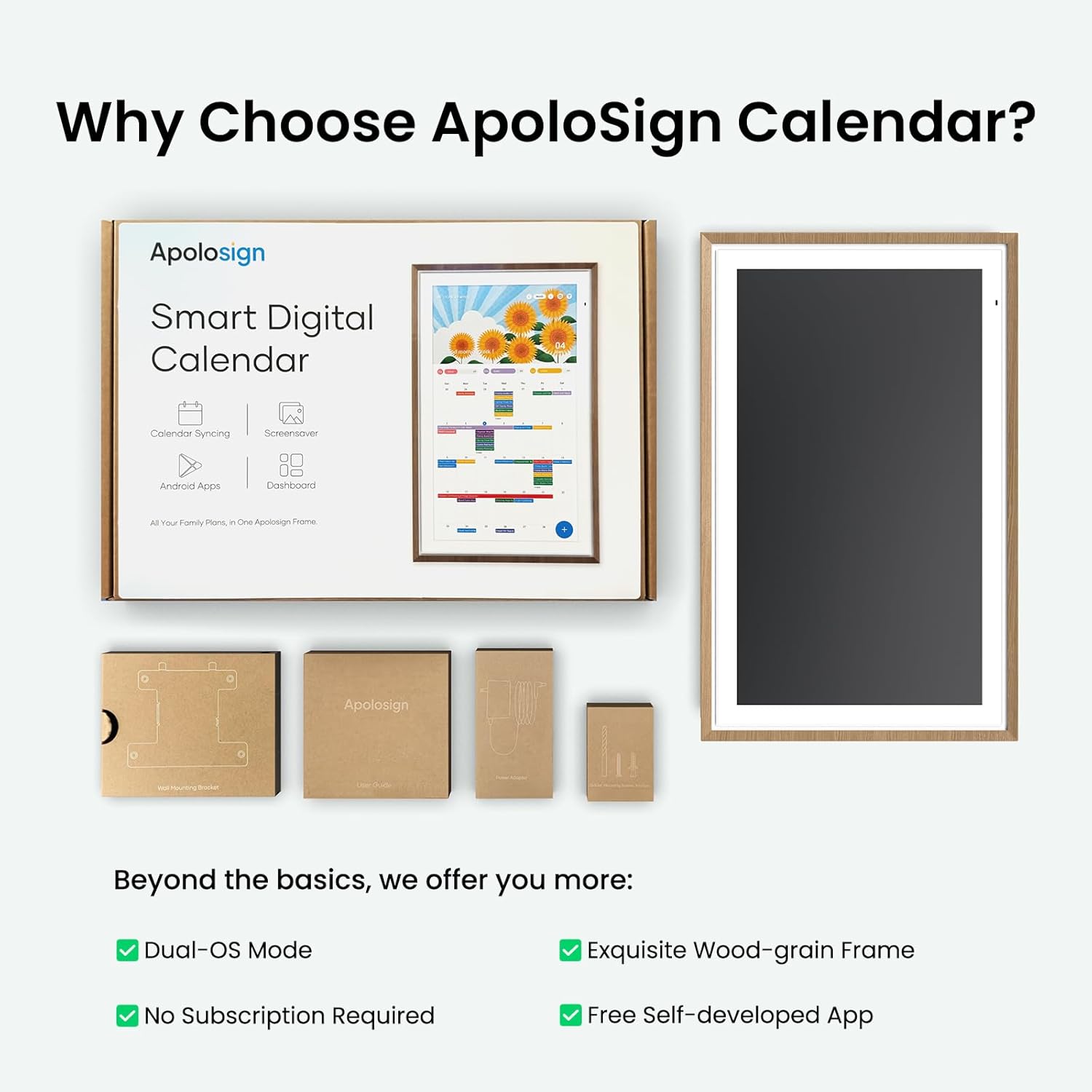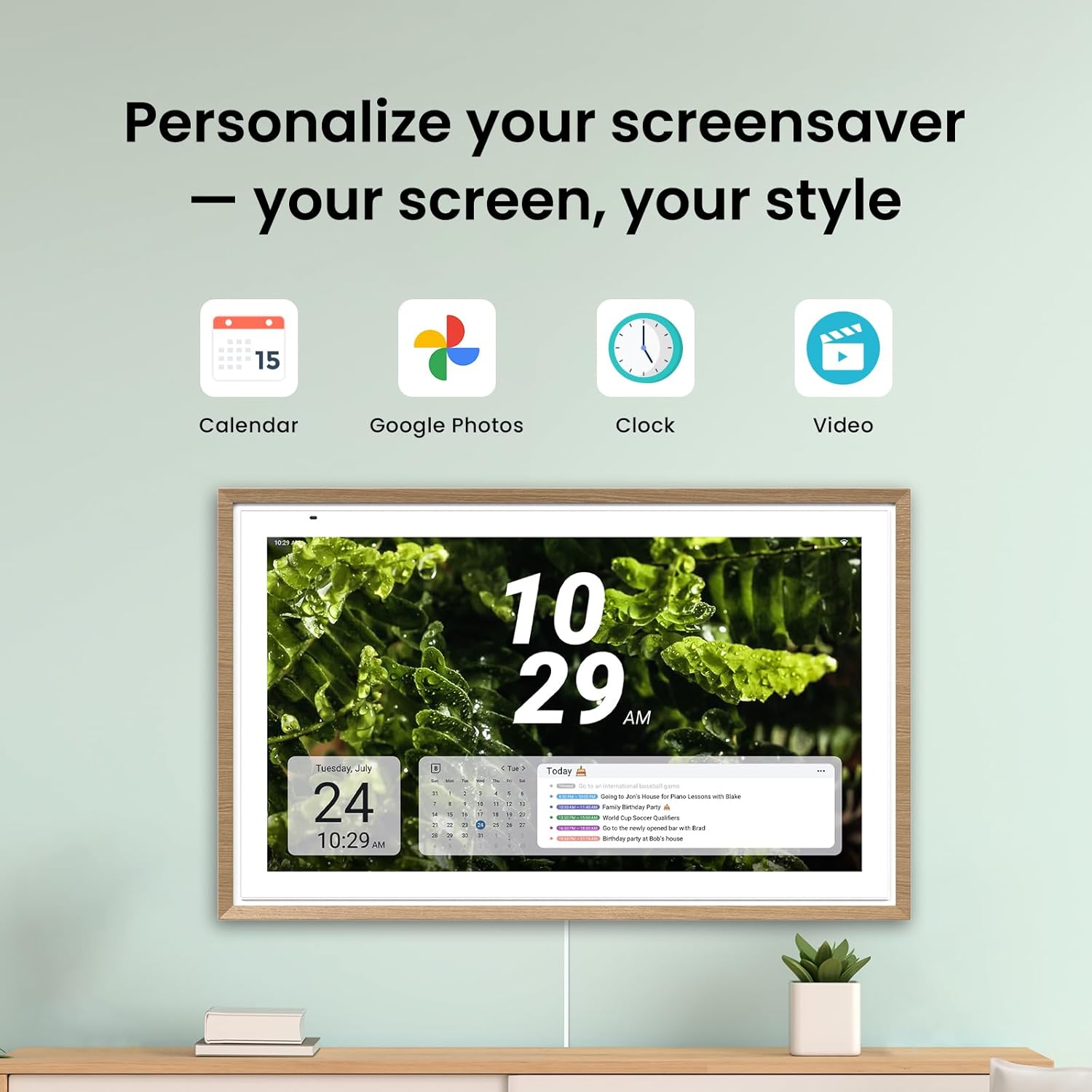 Smart Photo Frame & Live Screensaver The 27" HD touchscreen eCalendar displays memories from Google Photos and more seamlessly no subscription required. Personalize with videos schedules clocks or a mix. Anti-glare matte glass reduces eye strain in bright rooms. Auto Brightness adapts Sleep Mode saves energy. Beautiful faux wood frame for wall use.