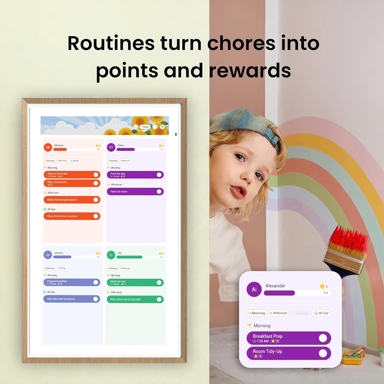 Reward-Based Chore Chart Routine & Meal Planner Turn chores into fun while keeping the whole family organized. This electronic calendar lets kids earn rewards for completing daily tasks and helps build healthy routines. Create color-coded to-do lists for groceries shopping wish lists and plan weekly meals to stay on top of family dining all in one place via the App (Currently available only in the U.S. Canada and the U.K.)