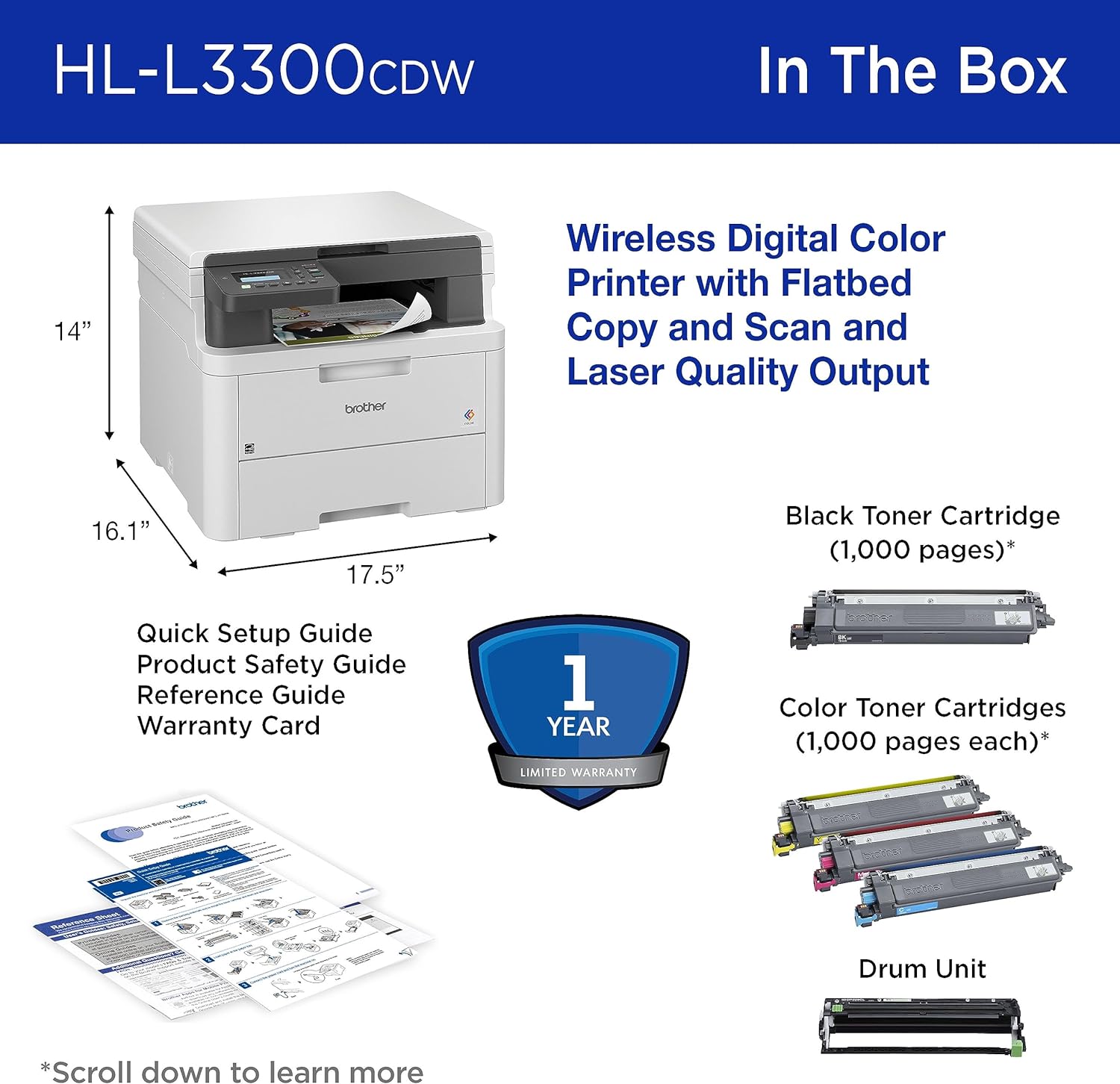 The HL-L3300CDW wireless multifunction digital color printer with copy and scan functionalities will help you accomplish more from your home or small office. Efficiently combining three functions in one its space-saving design eliminates the need for multiple pieces of equipment and is a sensible solution for freelancers consultants hybrid workers and solopreneurs. Producing exceptional print quality it consistently creates smudge-free documents that help elevate your professional presence. With seamless connectivity options effortless operation and reliable performance it is designed to complement where and how you work every time you need it. For peace of mind printing rely on advanced security features to safeguard sensitive documents and create secure connections to devices and networks. Engineered and supported by with a 1-year limited warranty and free online call or live chat support for the life of your printer the HL-L3300CDW is an effectiv e multi-tasking addition to any small workspace. 4.Disclaimers 1.Requires enrollment in a monthly billed Refresh EZ Print Subscription service plan based on monthly printed page allotments. Unused pages roll over limitations apply. Additional page set charges and taxes apply during trial. Plan options offer and pricing subject to change. Open to new subscribers located in the contiguous United States only. After the free trial period your credit card will be charged on a monthly basis for the Plan Fee Overages and Taxes in accordance with the Terms of Service. Overage fees will apply during free trial. Your service will continue on a month-to-month basis until you cancel it. May be canceled at any time. Upon cancellation cartridge will be deactivated and must be replaced at users expense in order to continue printing. 2.Based on one-sided printing. Change from default setting required. 3.Maximum capacity based on using 20 lb. paper. 4.Requires connection to a wireless network. 5.Free app download and wireless connection required. Compatibility may vary based on device and operating system. 6.Based on monthly subscription cost in U.S. for Color Laser High Plan vs. average cost per page of eligible like standard capacity cartridges. Savings will vary based on Refresh EZ Print Subscription plan selected. Wi-Fi Direct is a registered trademark of Wi-Fi Alliance. EPEAT is a trademark of the Green Electronics Council in the United States and other countries. ENERGY STAR and the ENERGY STAR mark are registered trademarks owned by the U.S. Environmental Protection Agency. Images are for illustrative purposes only. Specifications subject to change.