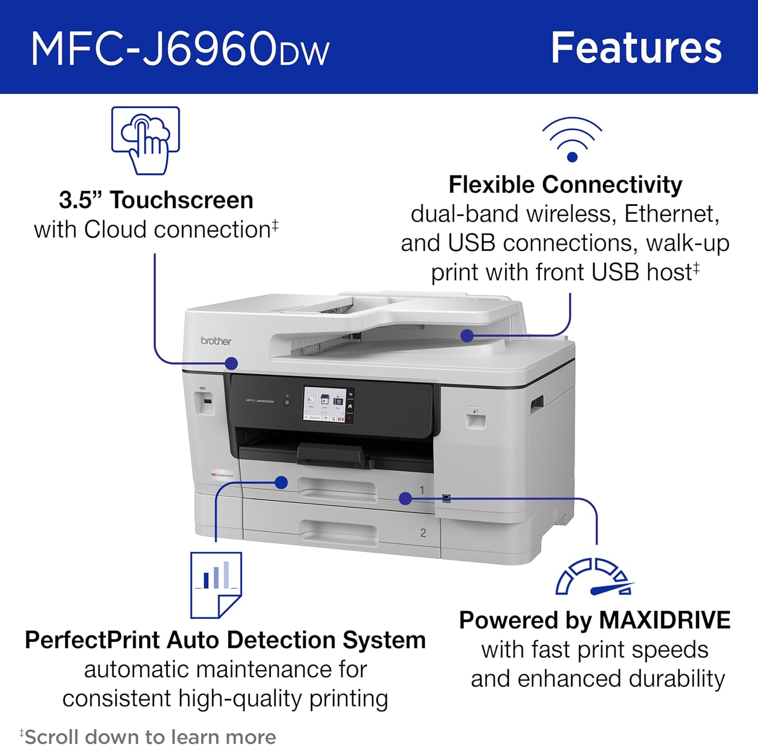 The INKvestment 6960 Wireless Color Inkjet All-in-One Printer was designed with impressive business-minded features to tackle your most robust day-to-day tasks. Optimize your productivity with print copy scan and fax capabilities up to 11 x 17 single-pass duplex (2-sided) copy and scan capabilities for up to 50-sheets via the automatic document feeder (ADF)(3) a 500-sheet paper capacity between two trays and 100-sheet multi-purpose tray(3). Convenient dual band wireless(4) and Cloud connectivity options(6) are available on the 3.5 color touchscreen. Maintain superior productivity from day one with fast print speeds and the right amount of ink in-box. This color inkjet printer reliably outputs vibrant colors and bold rich blacks and Page Gauge(8) monitors your ink usage so you know when youre running low. When paired with the Mobile Connect app setup is quick and easy plus youll gain the ability to print from virtually anywhere on your mobile device(7). Produce beautiful prints in vibrant color and bold blacks at fast print speeds with Genuine LC506 Ink cartridges the only brand recommends for your printer. Try one of s smart delivery systems with Refresh and have your ink delivered automatically before you run out. Includes a 2-month FREE Refresh EZ Print Subscription Trial(1) and built-in savings of up to 50%(9). Disclaimers (1) Refresh Free Trial requires enrollment in a monthly billed Refresh EZ Print Subscription service plan based on monthly printed page allotments. Unused pages roll over limitations apply. Additional page set charges and taxes apply during trial. Plan options offer and pricing subject to change. Open to new subscribers located in the contiguous United States only. After any applicable free trial period your subscription service plan will automatically continue and your credit card will be charged on a monthly basis for the Plan Fee Taxes and Additional Page Sets (if applicable) in accordance with the Program Terms of Service until you cancel which you may do at anytime. If your printer did not include a Refresh ready cartridge at purchase upon cancellation the subscription cartridge you received will be deactivated and must be replaced with a standard cartridge at your expense in order to continue printing. For full details or to enroll visit https://www.-usa.com/supplies/subscription-info. (2) Approximate page yields in accordance with ISO/IEC 24711. For additional page yield information see go./pageyield. (3) Maximum Capacity based on using 20lb. paper. (4) Wireless connection required. (5) Based on ISO/IEC 24734 (after first set of ISO test pages). For inkjet print speed methodology please visit www.-usa.com/printspeed. (6) Requires an internet connection and an account with desired service. (7) Free Mobile Connect App download wireless connection and connection of an eligible printer with are required. Compatibility may vary by device operating system and country. (8) Page Gauge is an estimate for informational purposes only. For actual cartridge yield information refer to go./pageyield. (9) Based on combined value of the included extended limited warranty plus monthly subscription cost in U.S. vs. purchase of an extended limited warranty plus average cost per page of standard replacement cartridges. Savings will vary based on Refresh EZ Print Subscription plan selected. (10) USB Host JPEG only.