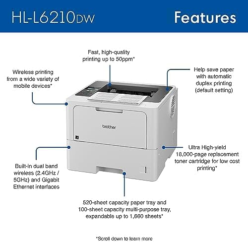 • Professional Laser Printer with High-Speed 50 ppm Output Advanced Security Features and Wireless Networking for Business Monochrome Printing with Duplex Capability (HL-6210DW)