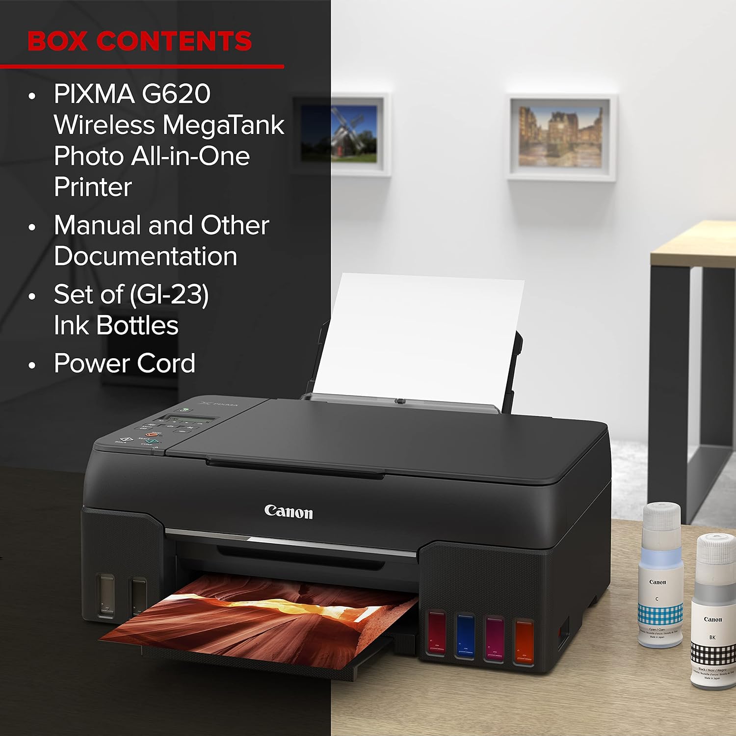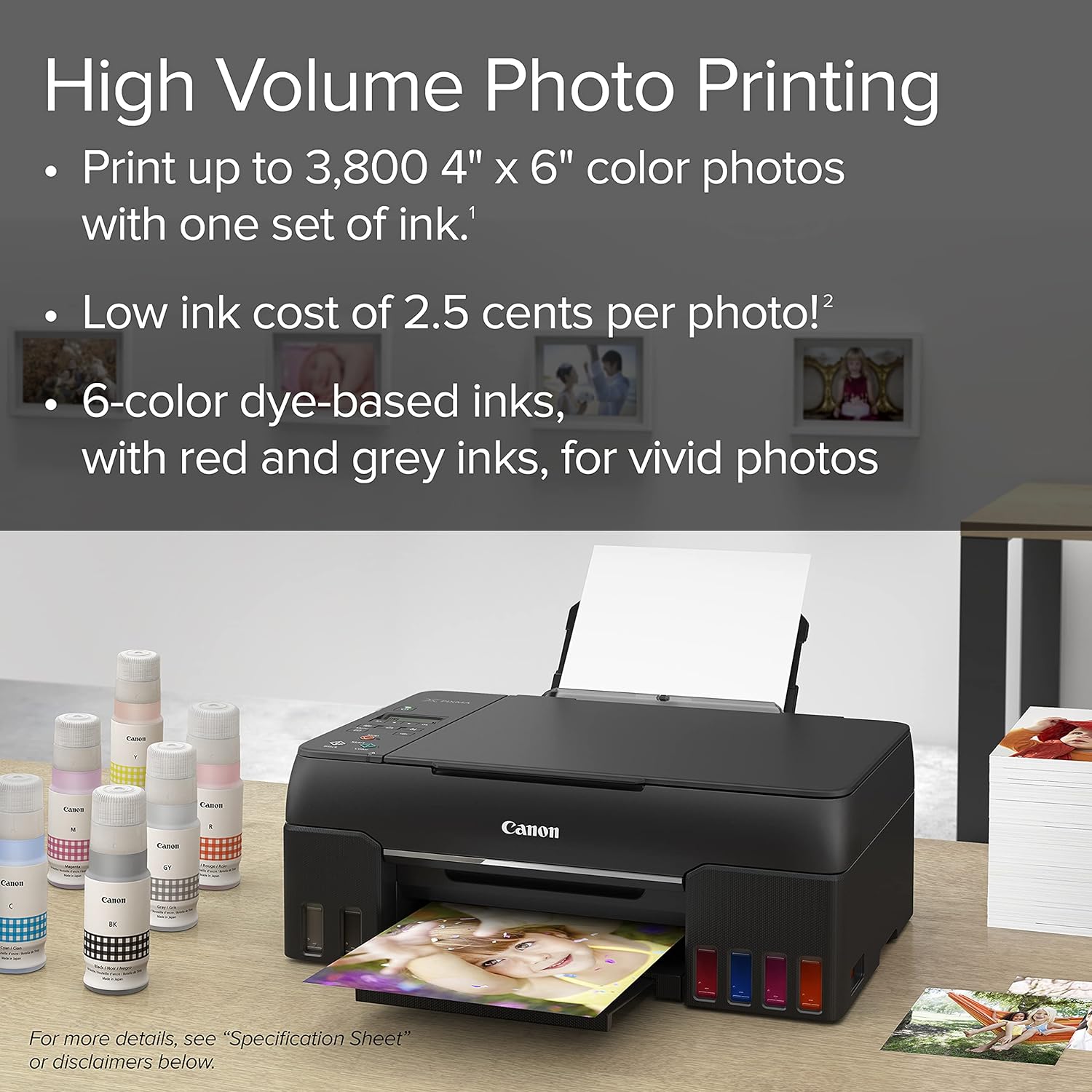 Print more stunning photos for less with the PIXMA G620 MegaTank Photo Printer. On just one full set of ink bottles you can print up to 3 800 4 x 6 color photos1 just 2.5 cents per print2 With a 6-Color Dye-based Ink system including Red and Gray inks you will get beautiful vivid photos with an expanded color gamut. Designed for high volume high quality photo printing the PIXMA G620 is perfect for memory makers & keepers for photo albums scrapbooks and more. Plus setup out of the box is a breeze and printing is easy through high-speed USB or wirelessly4 from a computer or mobile devices.