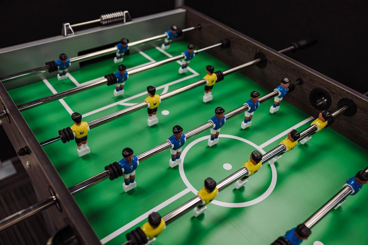 Experience unmatched durability and sophistication with this professional-grade foosball table engineered with stainless steel telescopic rods composite resin players and a 6-mm composite playfield to perform in any environment. The elegant wood grain finish paired with powder-coated steel accents brings a refined touch that enhances upscale recreation rooms. Precision-balanced rods provide smooth responsive gameplay suited for both seasoned competitors and casual players. Built for versatility its stainless steel floor plates and 10-mm composite resin cabinet allow for reliable indoor and outdoor play. Thoughtful extrasincluding zinc-anodized metal score counters six tournament-style soccer balls and a breathable ventilated storage cover with drawstringscomplete the premium package making this foosball table a standout centerpiece for elevated entertainment spaces.