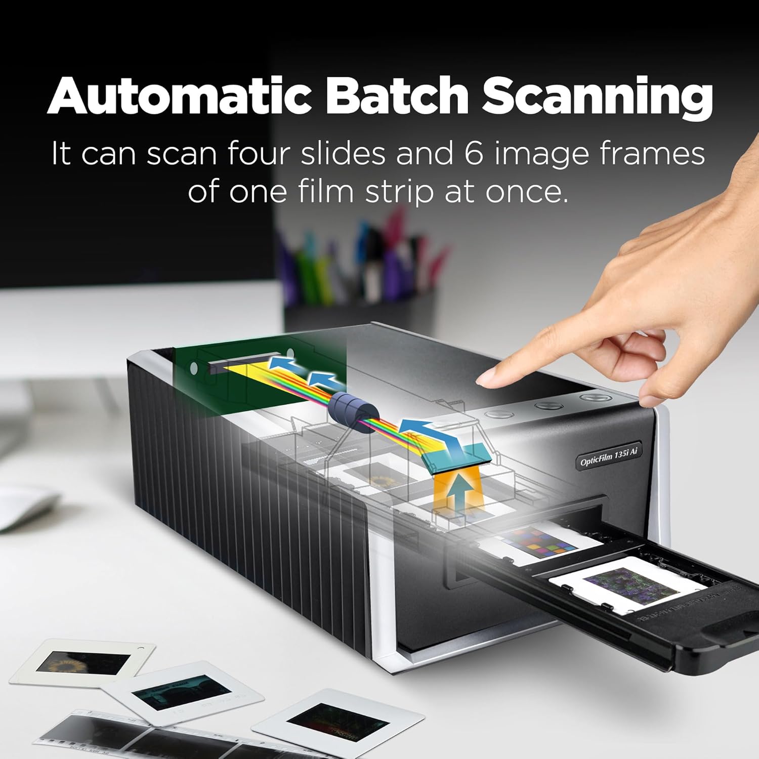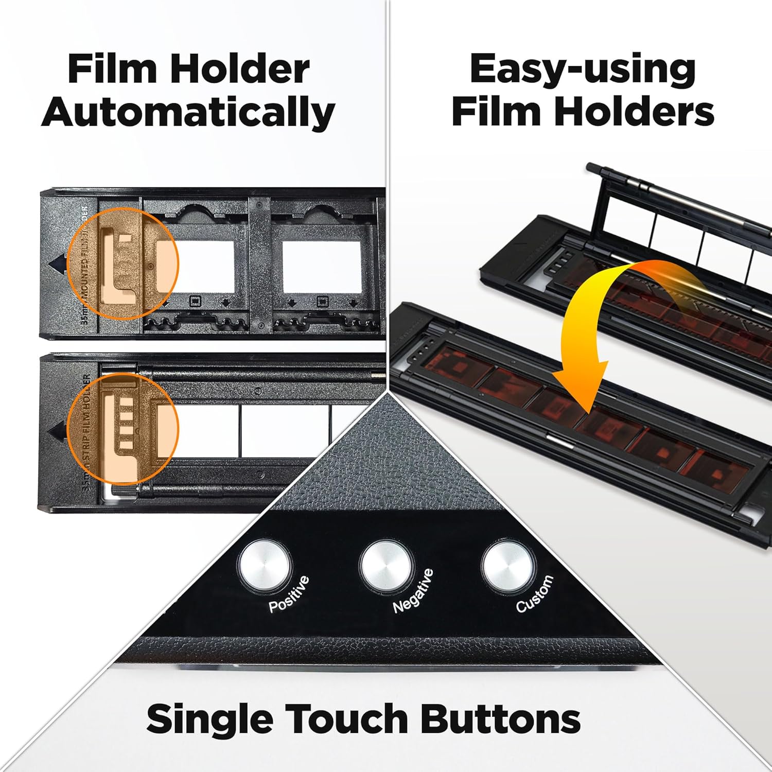 Greater Productivity Batch scan multiple slides and negatives with ease. The scanner comes with two sets of film holders allowing you to scan four slides or six image frames from a single film strip at once time.