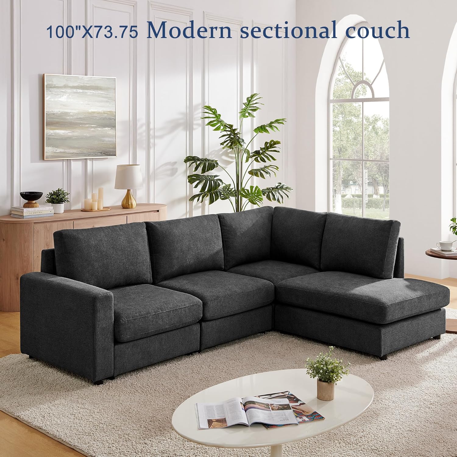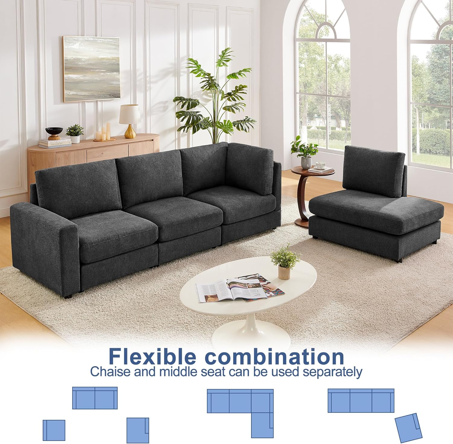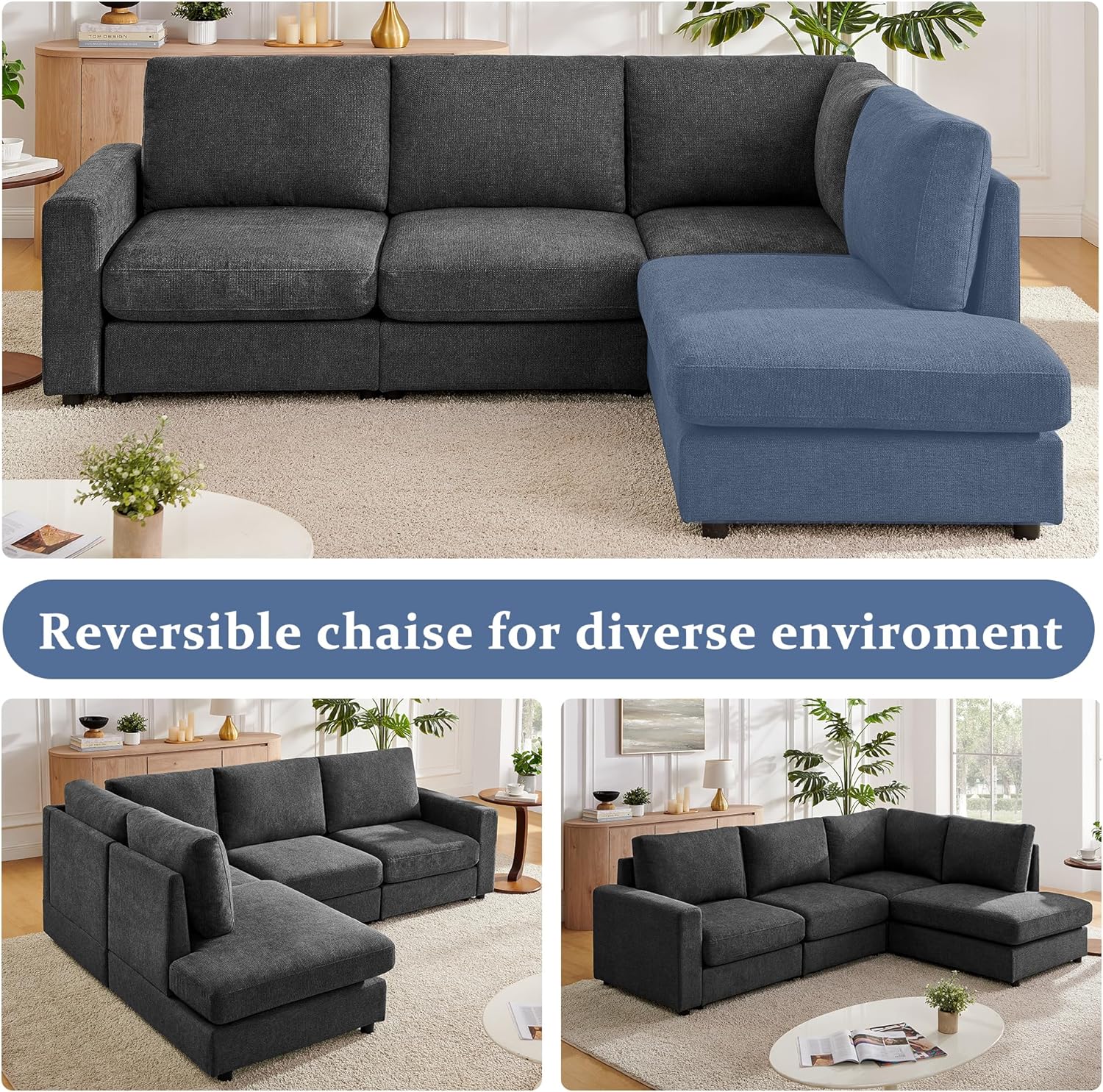 Sectional Sofa with Chenille Fabric : This comfy sofa combines a luxuriously soft texture with exceptional durability. Resistant to wear and easy to maintain, the chenille upholstery ensures long-lasting elegance, making it ideal for both everyday use and stylish living spaces.