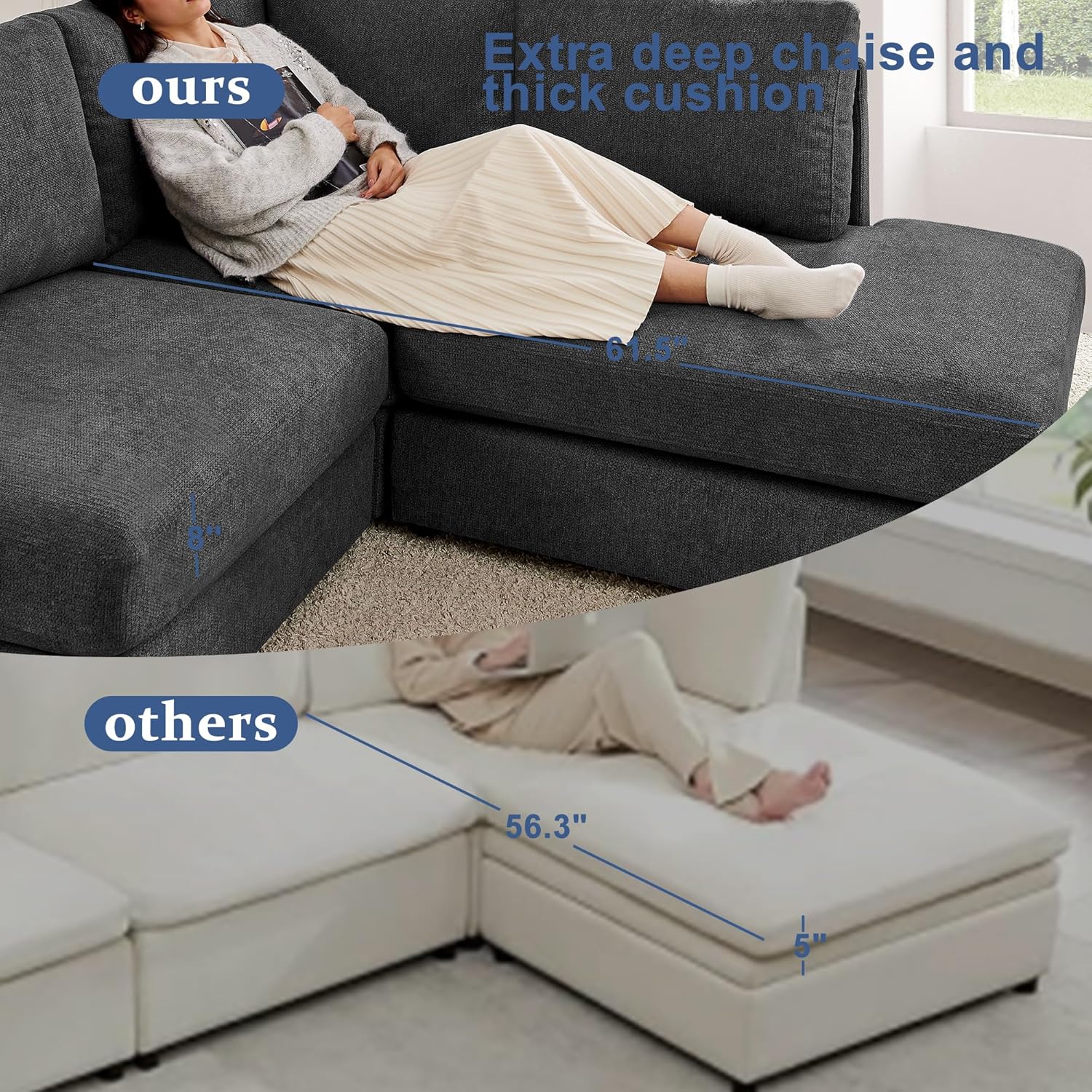 Comforting Seat: The L couch sectional with fully high-density foam cushions and offers generous seating capacity ,expecially chaise lounge with depth 61.5" ,would confortably fit an adult to half lying there and enjoy the movie time .