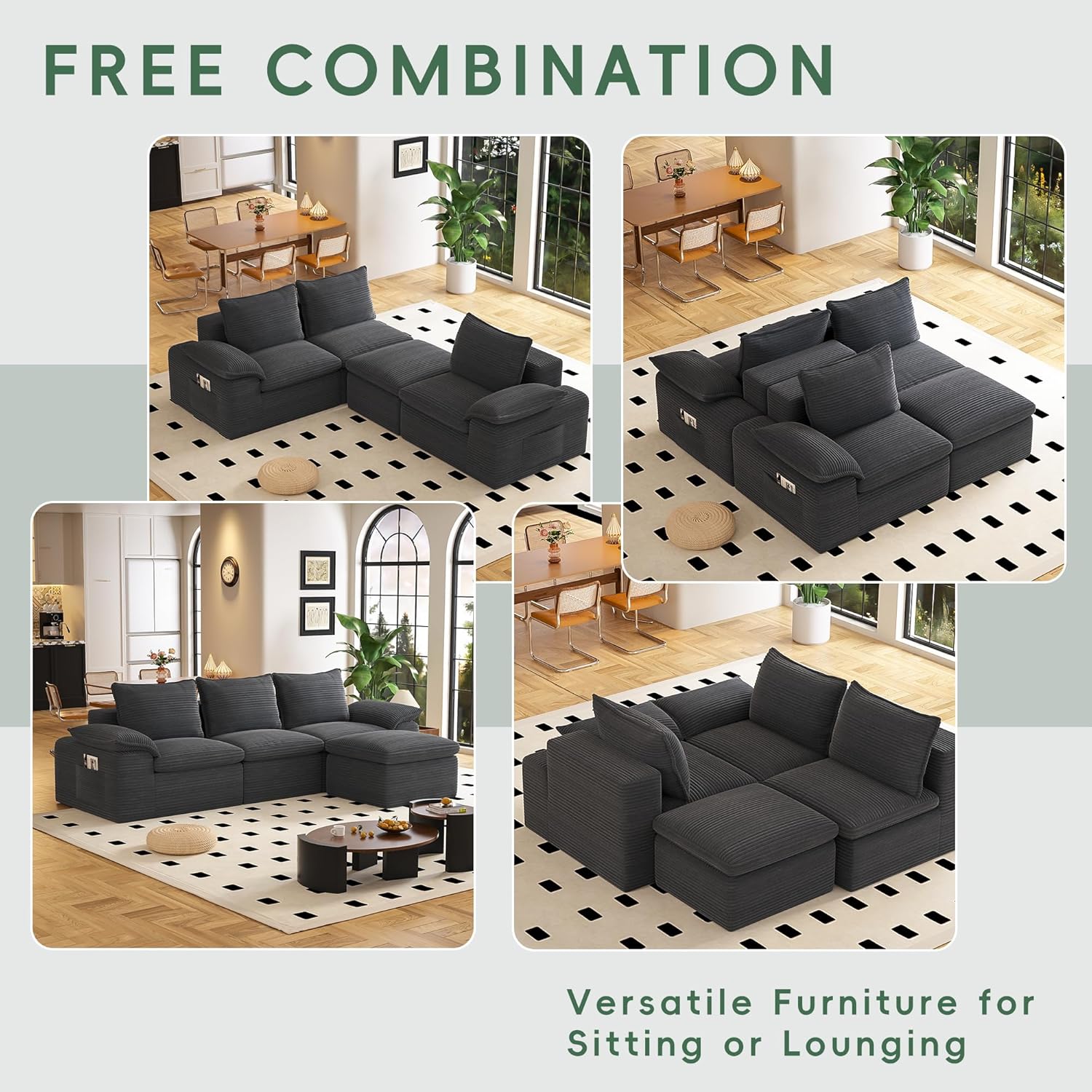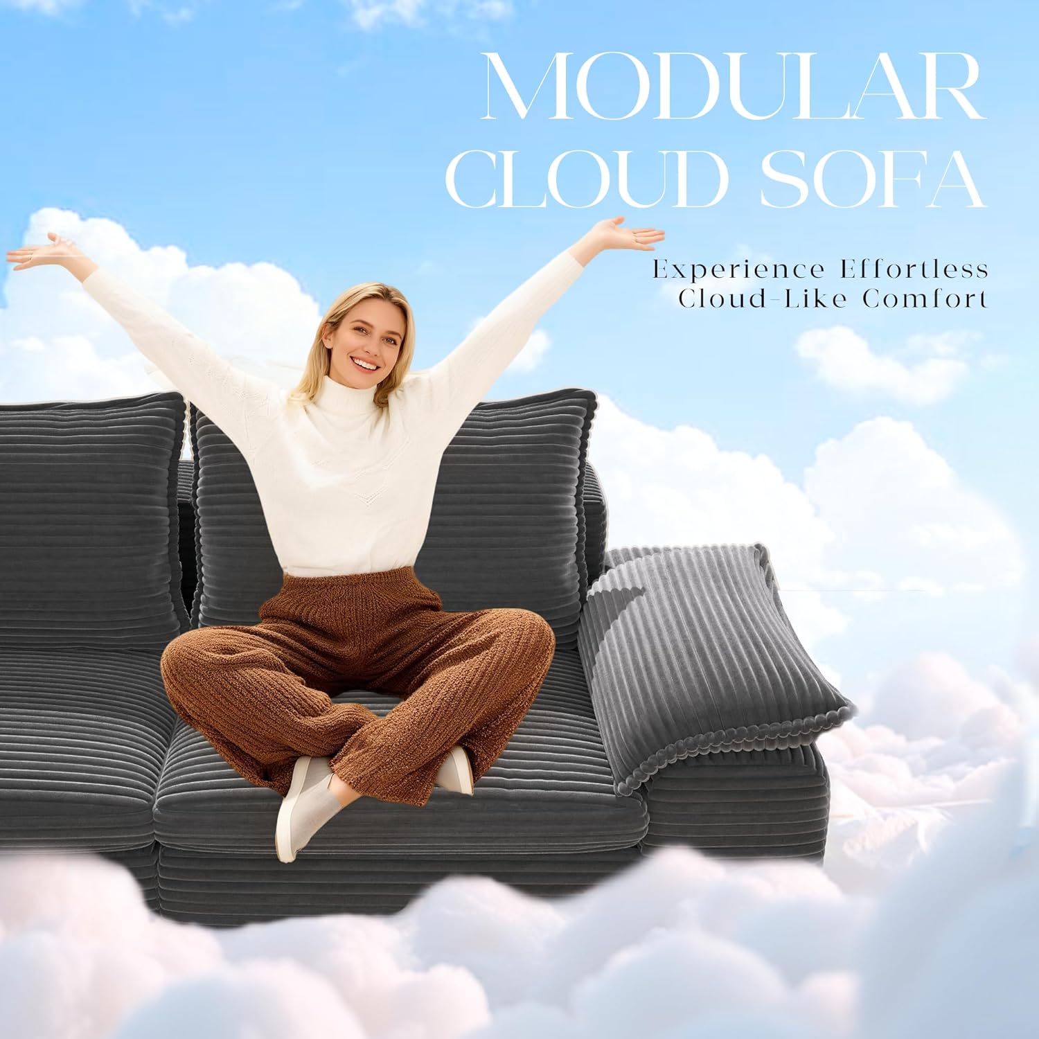 Modular Sectional SofaThis 104" cloud modular sectional sofa couch for living room can be easily arranged as an L shaped sofa for corner fitting, separated into a spacious sofa bed for guests, or used as individual lounge chairs, functioning as a versatile sofa set for living room. It adapts easily to your living room, bedroom, or small apartment, maximizing space for relaxation or gatherings.
