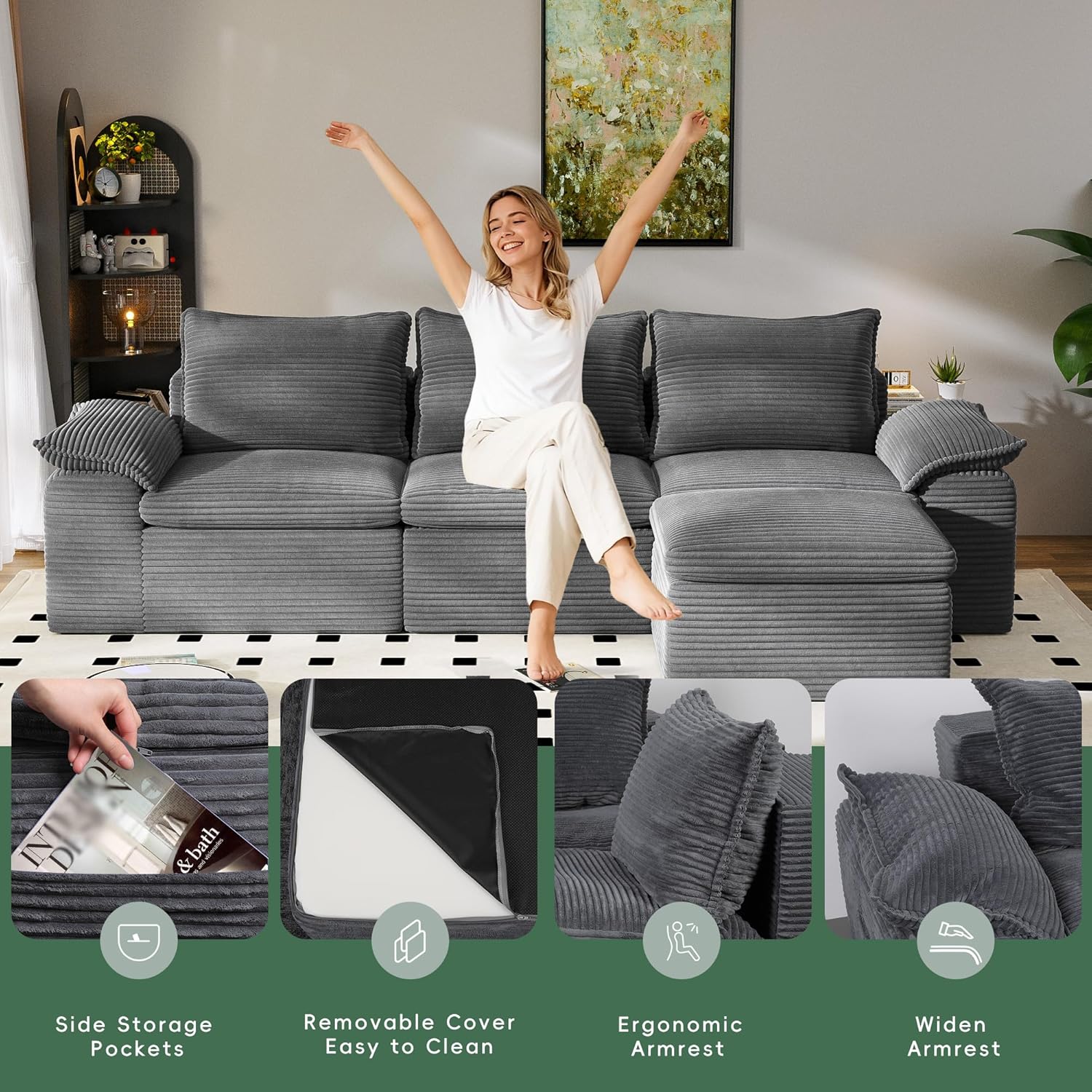 Deep Seat & Back CushionsOur modern modular sofa features spacious seating and comfortable back support, We've upgraded the back cushions of our cloud couch, providing superior lumbar support and preventing that uncomfortable sinking feeling. The oversized chaise lounge meets all your needs