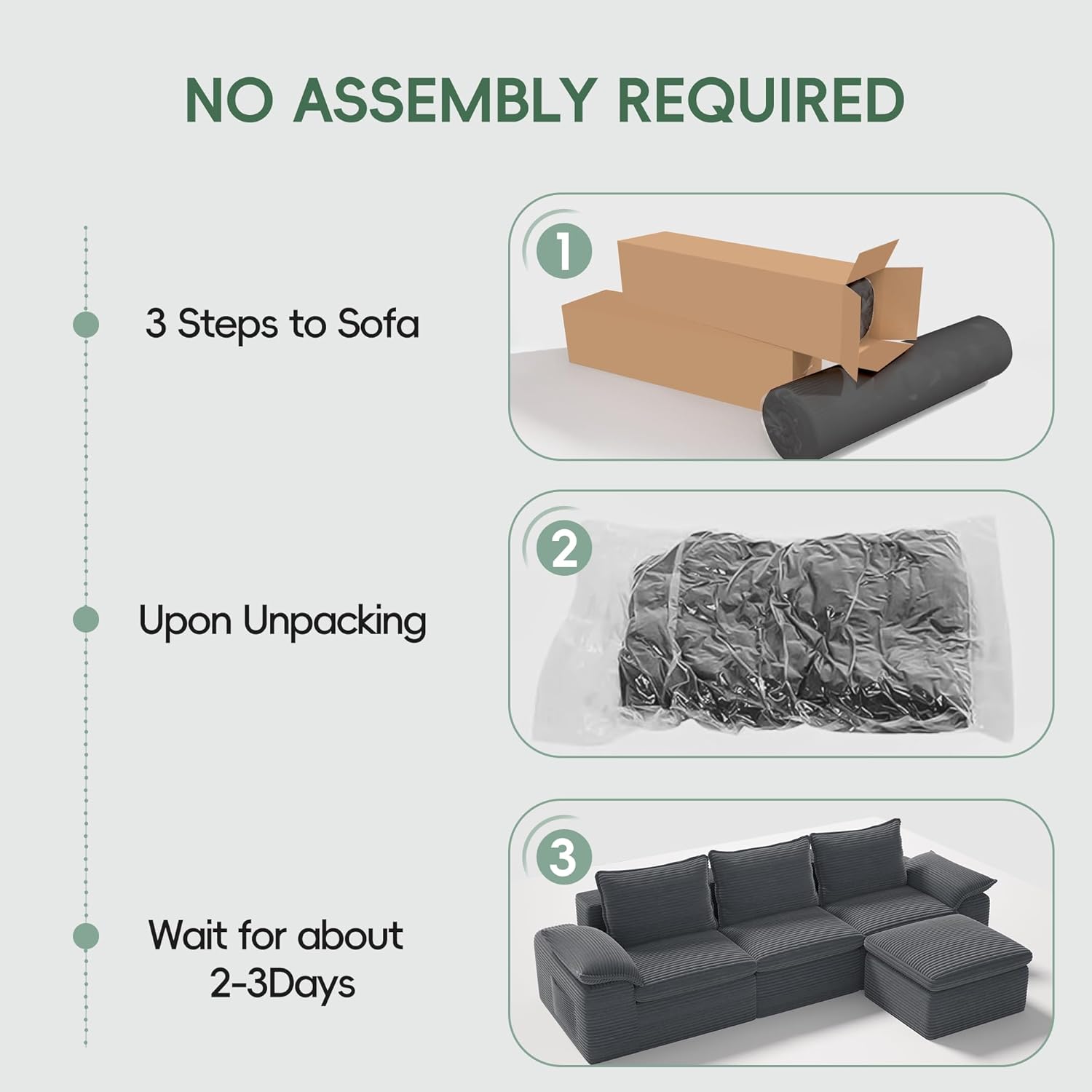 No Assembly, Instant ComfortArrives in 1 convenient packages with no assembly required. Simply unbox the cushions, fluff the cushions, arrange them to your liking, and watch them expand to full comfort within 48-72 hours