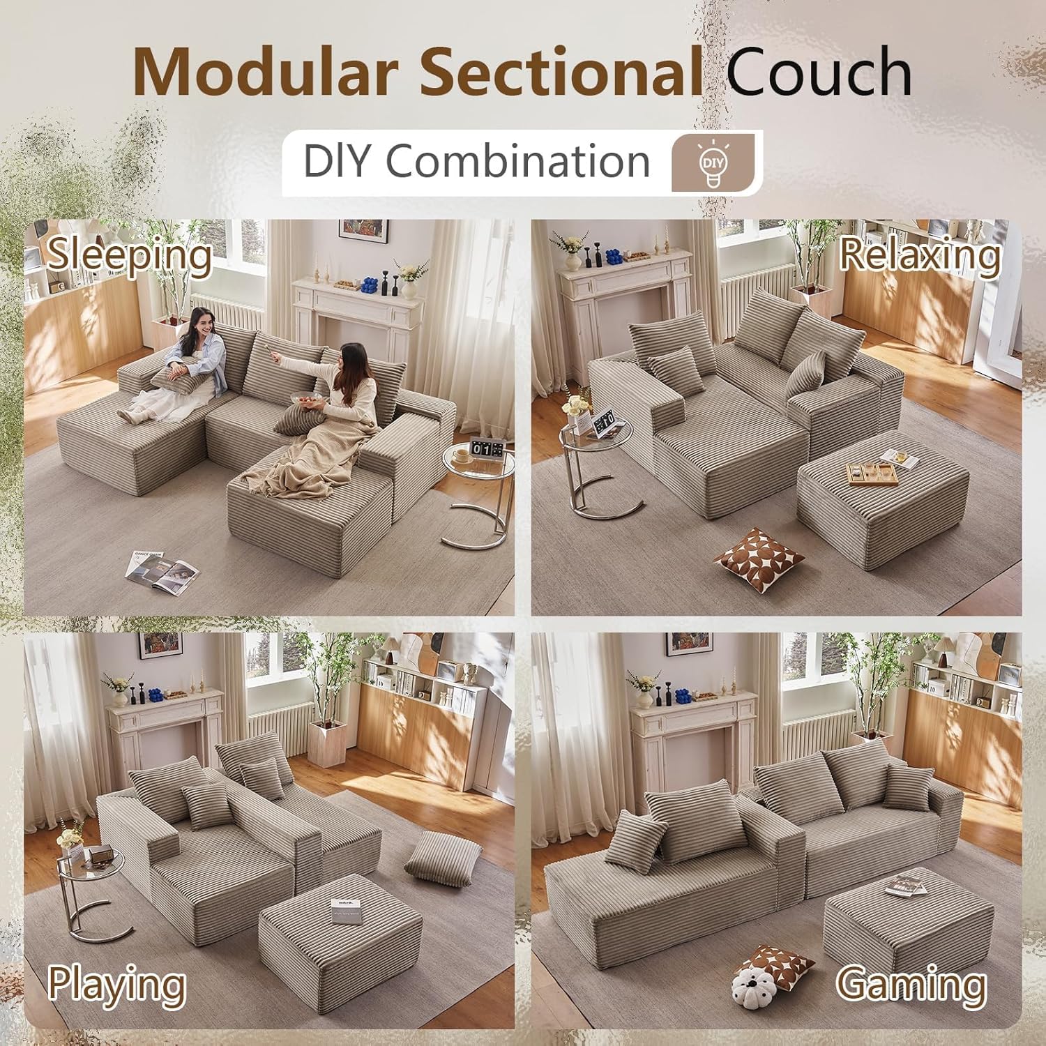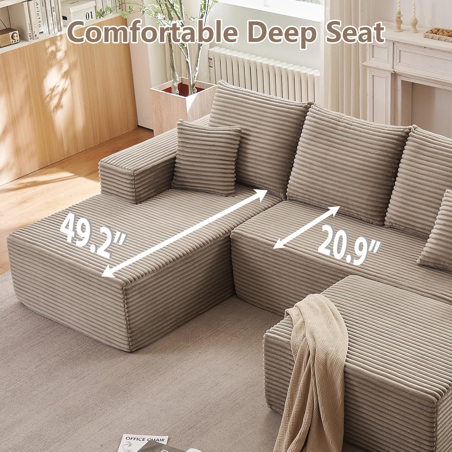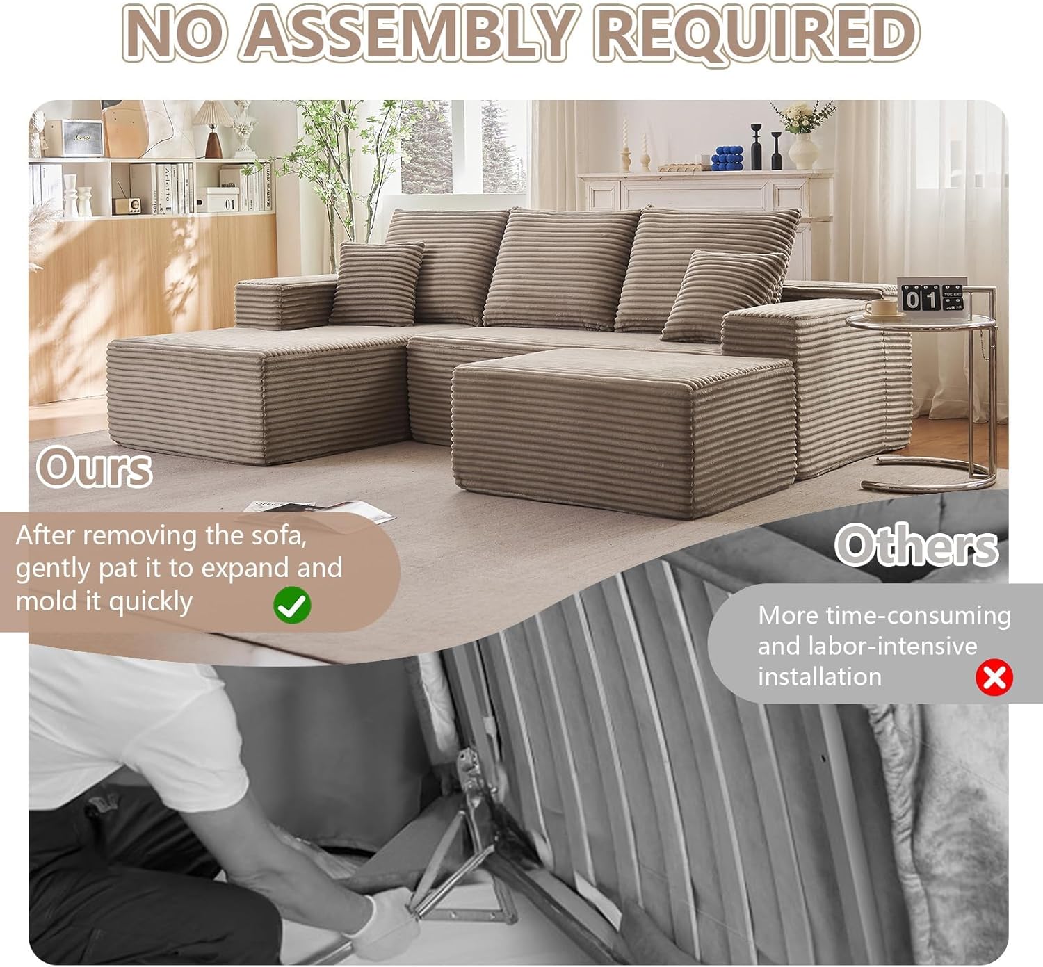No Assembly Required: Say goodbye to furniture assembly nightmares. Our modular cloud corner sofa arrives compressed in 2 boxes. Simply unbox all pieces, gently tap each section to restore its springiness, and poofit transforms back to photo-ready perfection, It might take up to 72 hours to fully revive