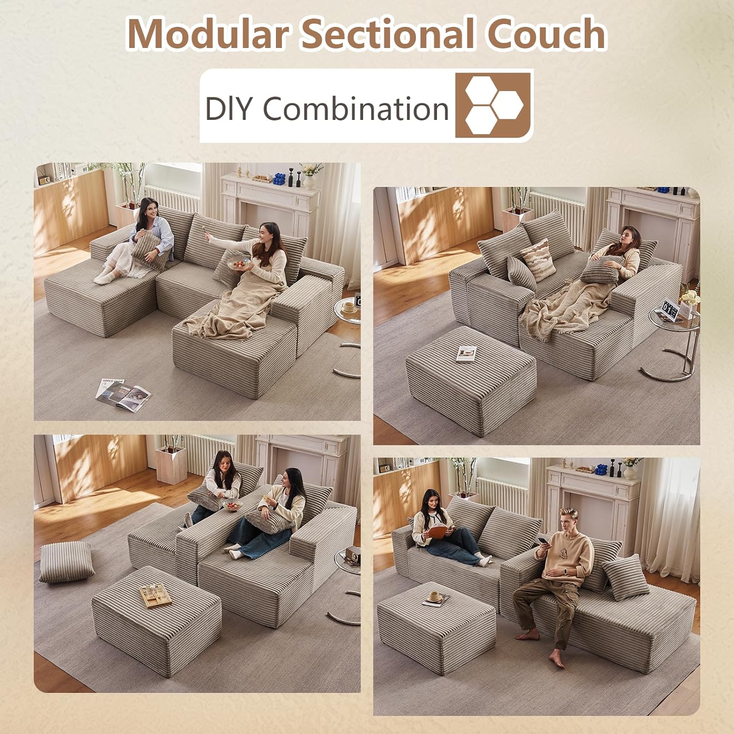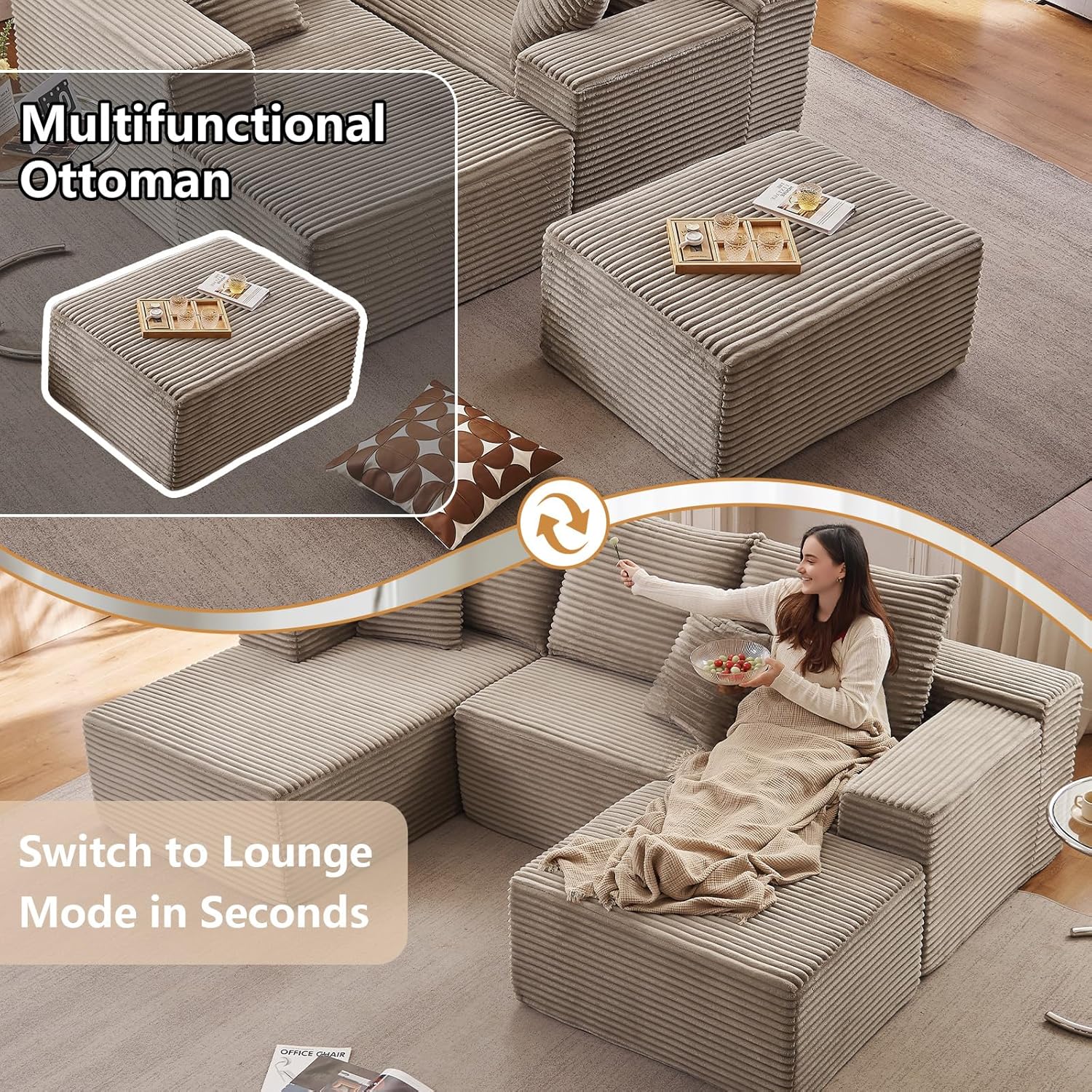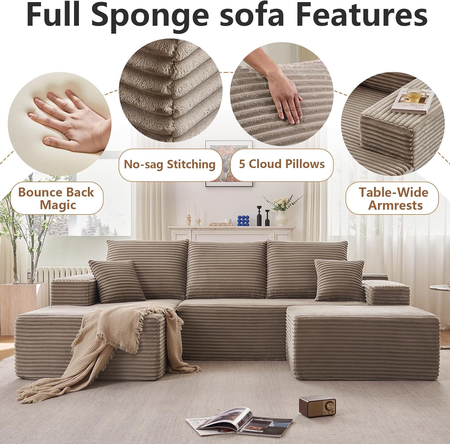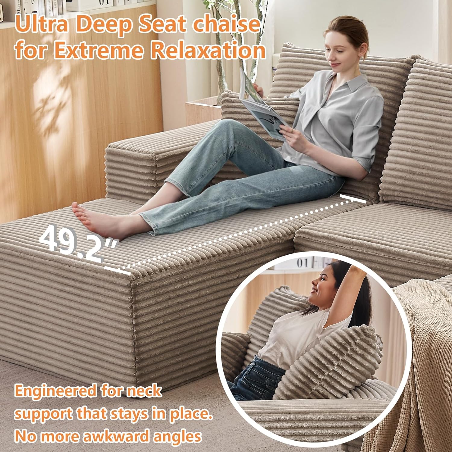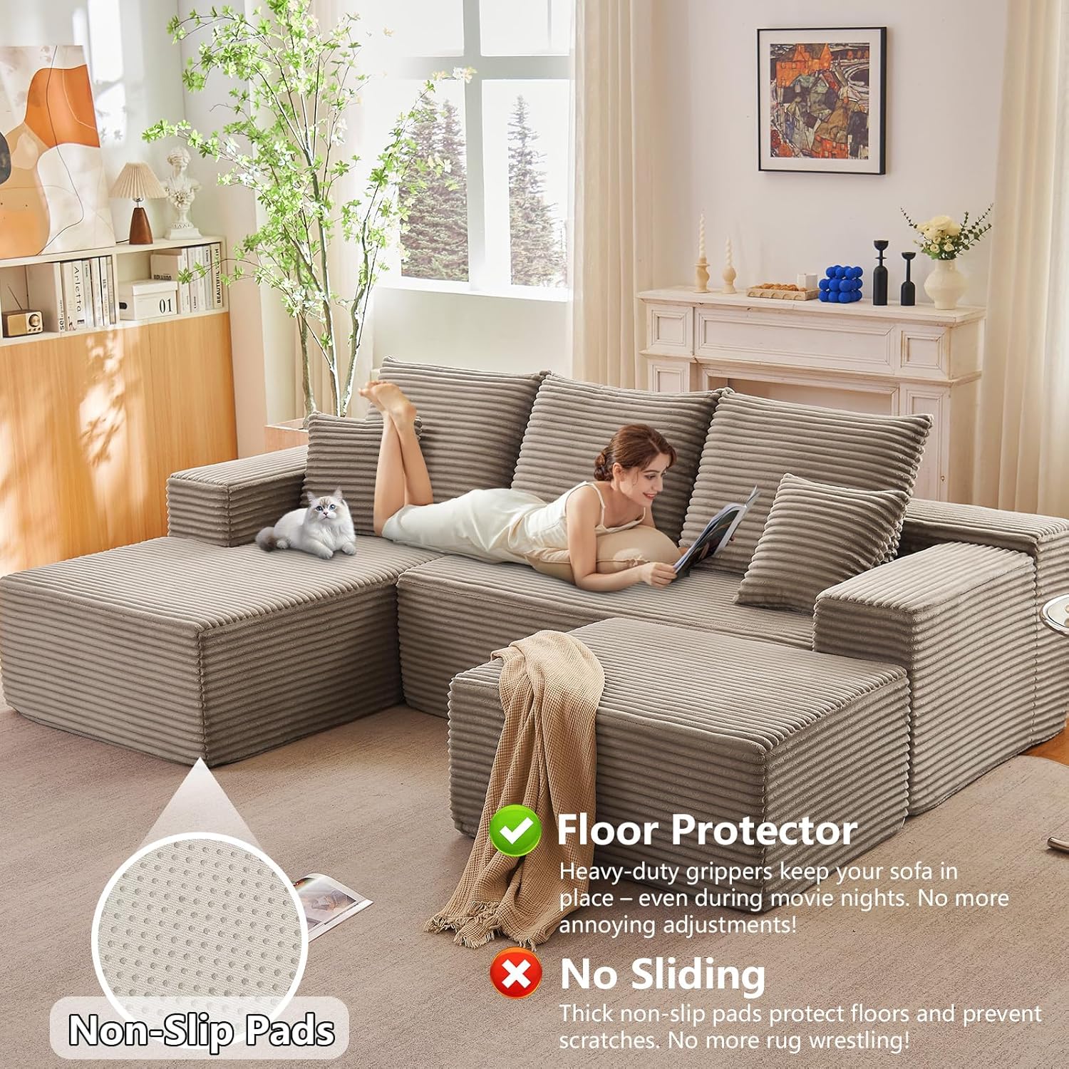Luxurious Corduroy Upholstery: Sink into luxury with our premium corduroy fabric, designed for softness, breathability, and long-lasting durability. This skin-friendly material provides a comfortable seating experience while adding an elegant touch to your dcor. The boneless sofa includes 3 large cushions and 2 throw pillows, enhancing both comfort and the longevity of your furniture. A perfect blend of modern style and functional comfort for any home