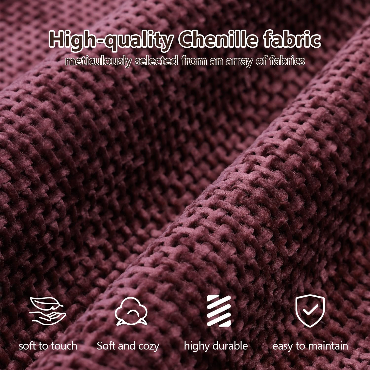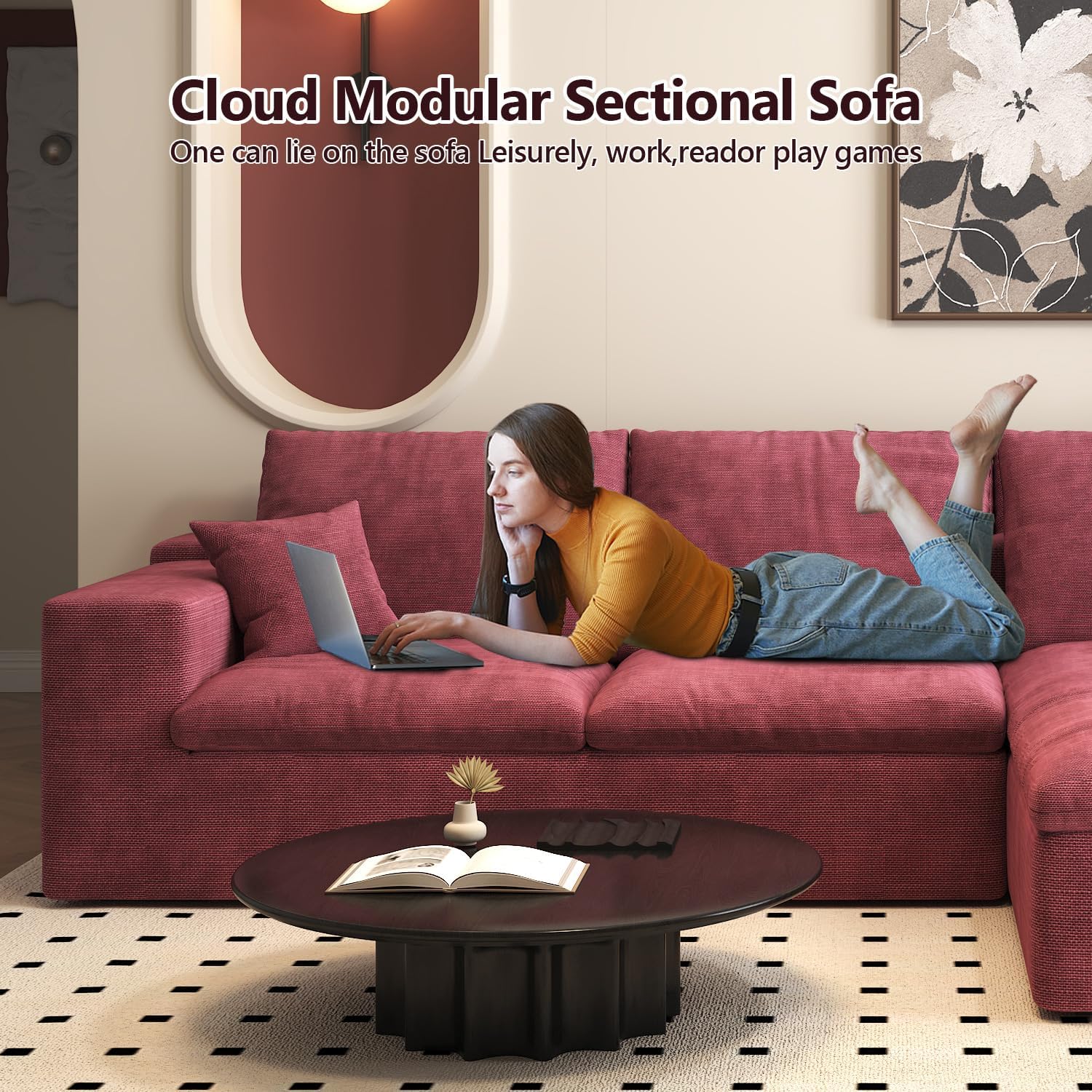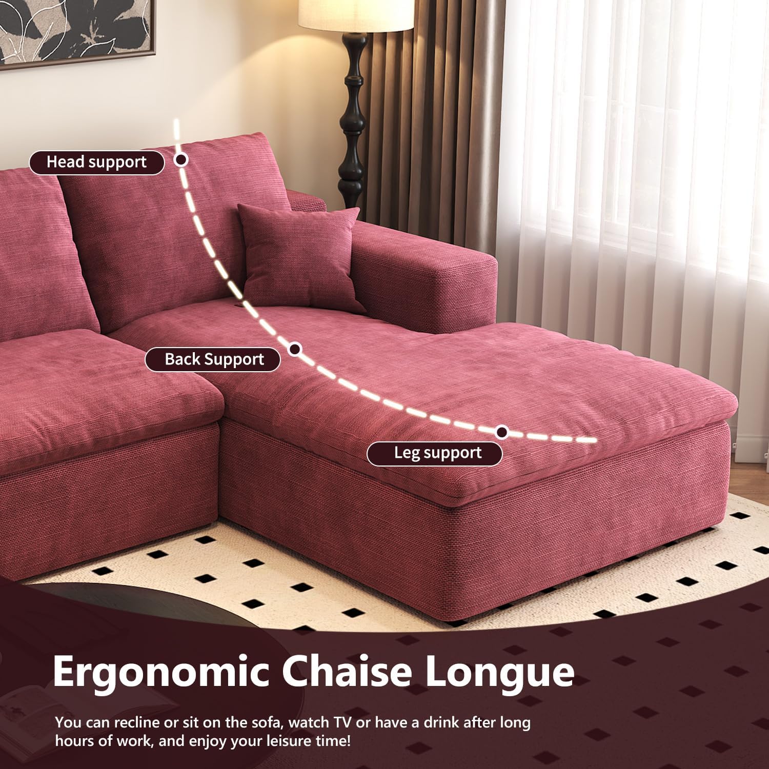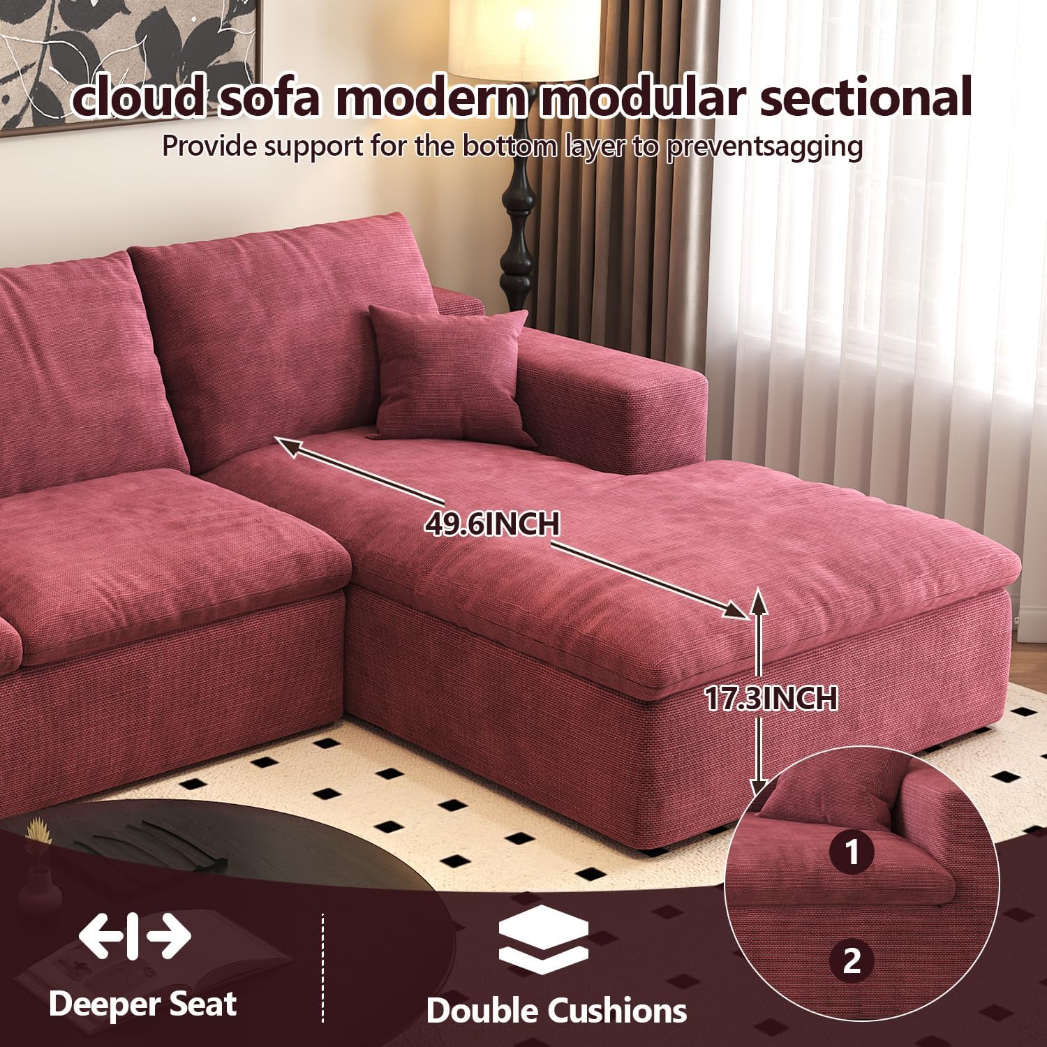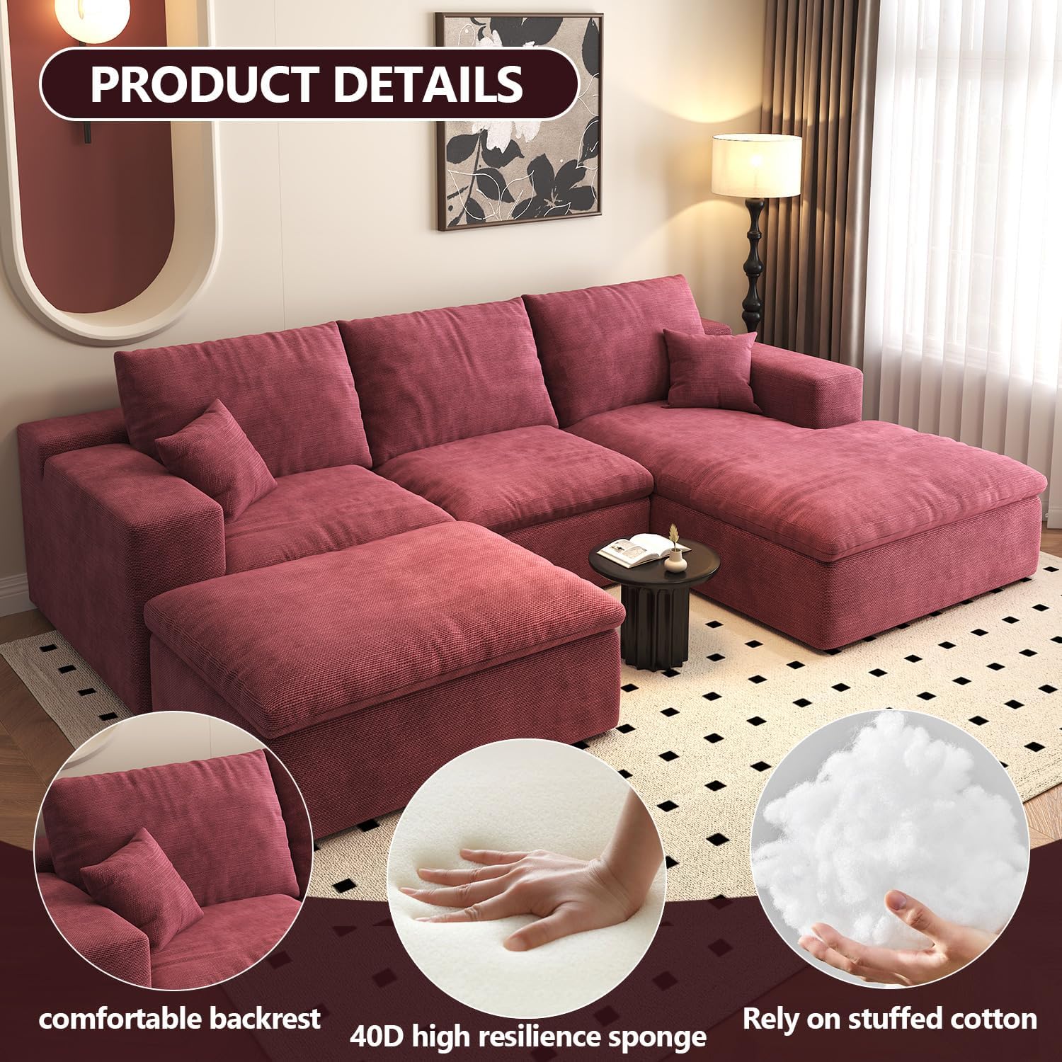 • 107'' U-Shaped Modern Modular Sectional Cloud Couch Whit Ottoman, 4-Seat Chenille Deep-Seat Sofa with Pillow for Living Room, Bedroom, Apartment, Wine Red