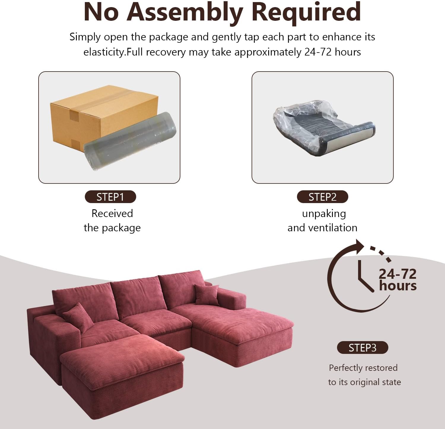 No Assembly Required:Be ready in 1 step! Setting up this cloud couch with ottoman is incredibly easy Simply unbox the cushions, place them together, and let them naturally expand over 48-72 hours No extra tools or complicated assembly steps are needed Its ready to use this cloud sofas for living room with minimal effort