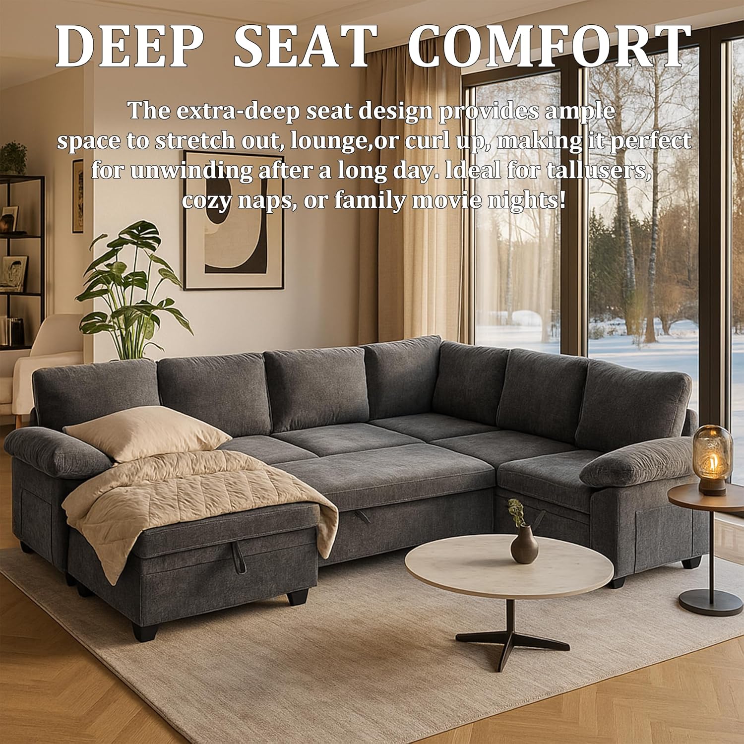 Deep Seater & Hidden Storage: The generous seating depth of our sleeper sofa provides a lounging experience, reversible sectional adapts to your space, perfect for relaxing or entertaining. This couch conceals a spacious storage compartment underneathperfect for stowing children's toys, extra blankets, and other items, keeping your living room sofa area neat and tidy.