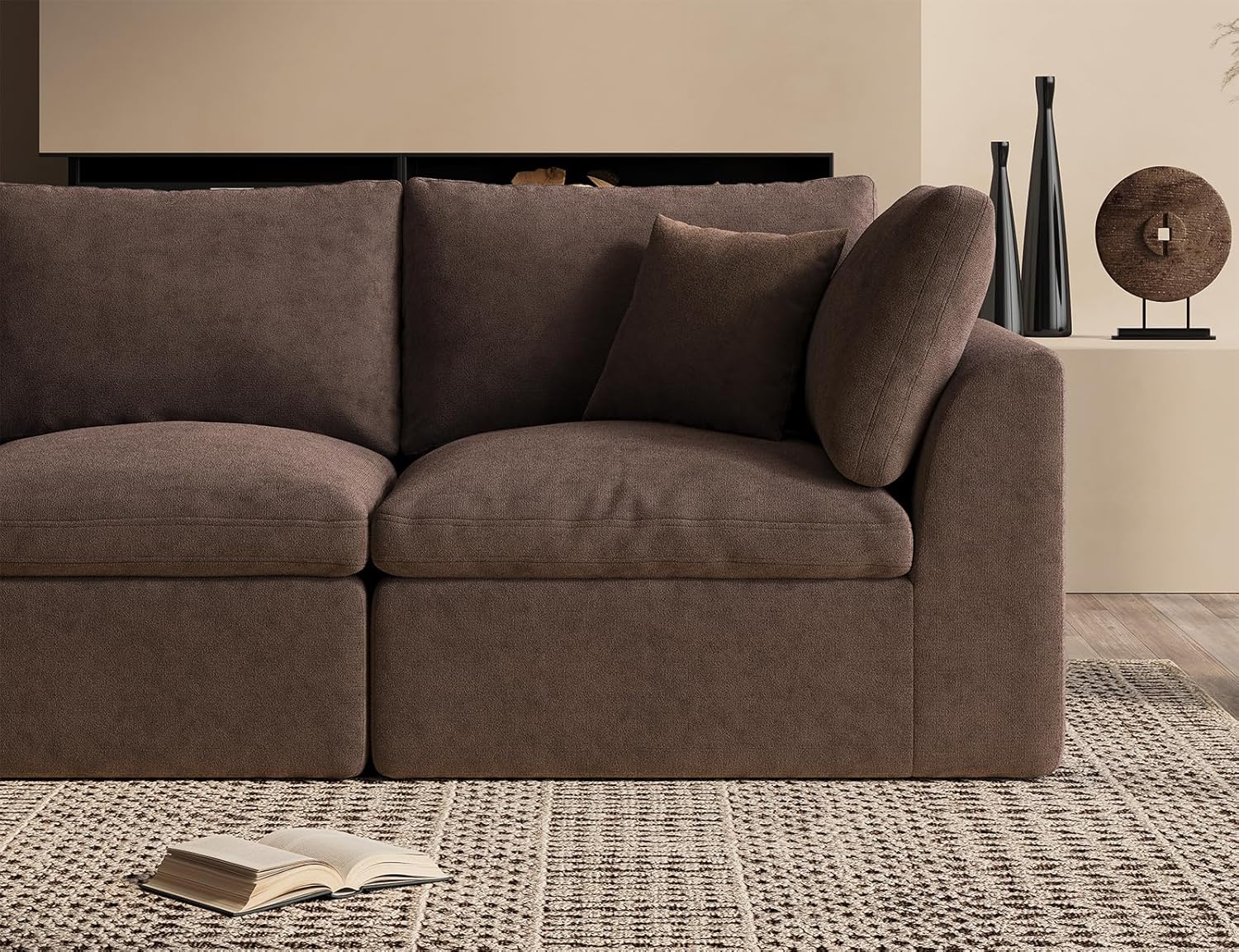CLOUD-LIKE DESIGNThis large L shaped couch provides a truly cloud-like sitting experience with its high-resilience foam filling, thick armrests, and deep cushions that deliver excellent elasticity and support. The soft, skin-friendly chenille fabric used in this deep seat modular sofa adds both comfort and a touch of luxury. The removable pillow covers make cleaning easy and convenient.