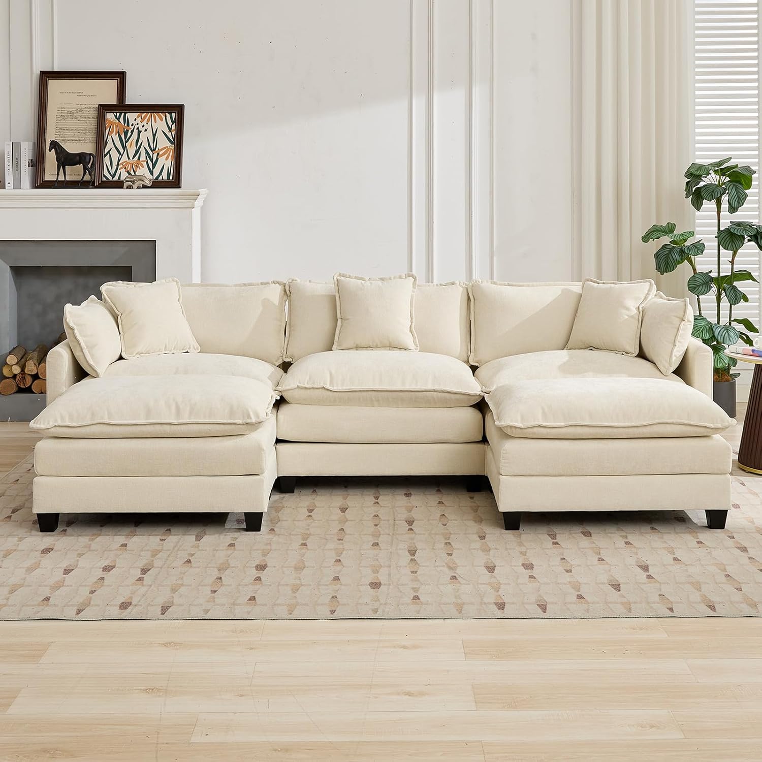 • 111.5" Beige Modular Sectional Sofa, 3 Seater Large Sectional Couches for Living Room, Ivory Off-White Chenille Fabric Oversized Cloud Couch with Ottoman, Modern Sofas Set, Sofas para Sala, U Shaped