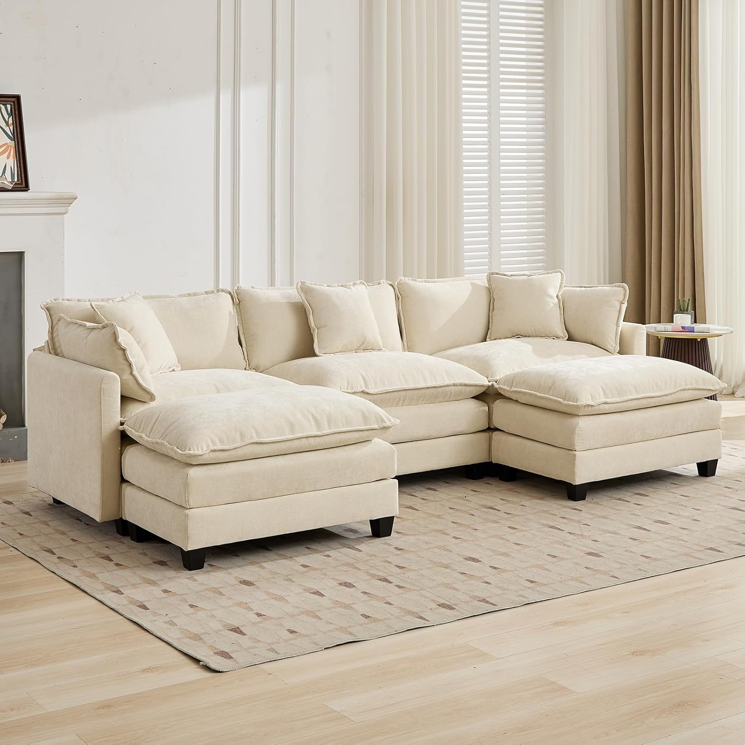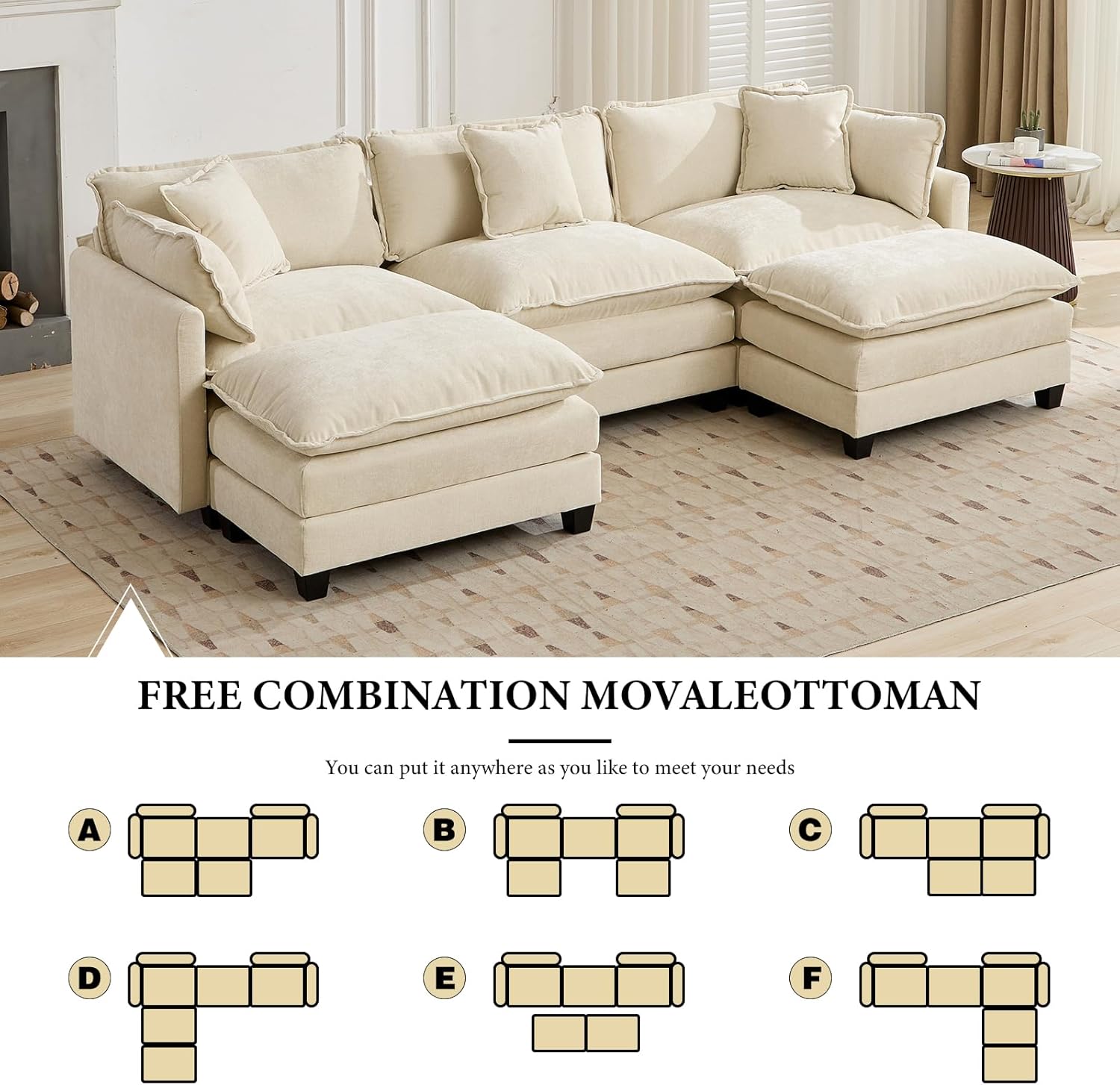• 111.5" Beige Modular Sectional Sofa, 3 Seater Large Sectional Couches for Living Room, Ivory Off-White Chenille Fabric Oversized Cloud Couch with Ottoman, Modern Sofas Set, Sofas para Sala, U Shaped