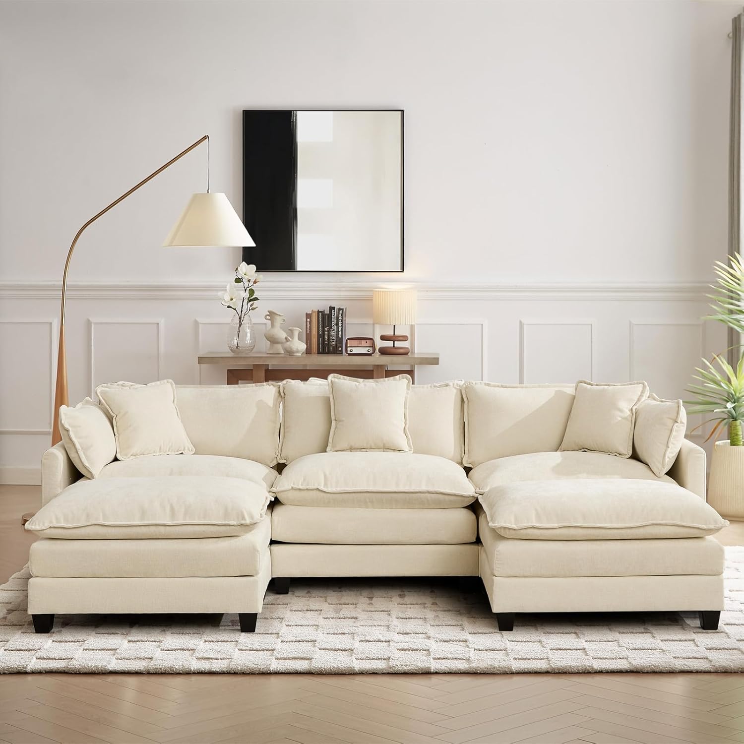 • 111.5 Modular Sectional Sofa L-Shaped Convertible Couches, 3 Seater Chenille Deep Seat Sleeper Cloud Couch with Pillows and 2 Ottomans for Living Room, Apartment, Office(Beige)