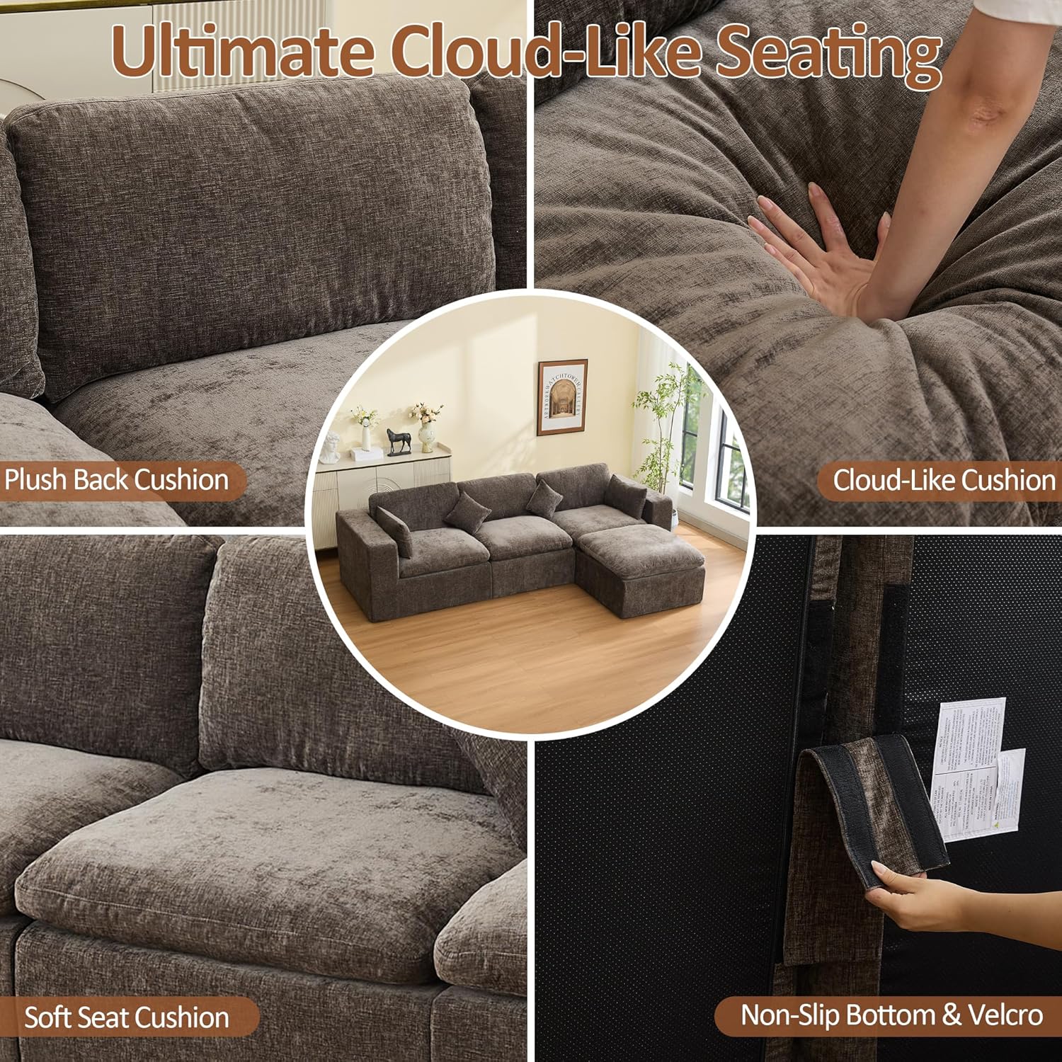 • 115''Cloud Boneless Sectional Couch, Modular Sectional Sofa Deep Seat with Ottoman, Oversized Upholstered Convertible Comfy 4 Seater Chenille Sofa L Shape Couches for Living Room, Brown