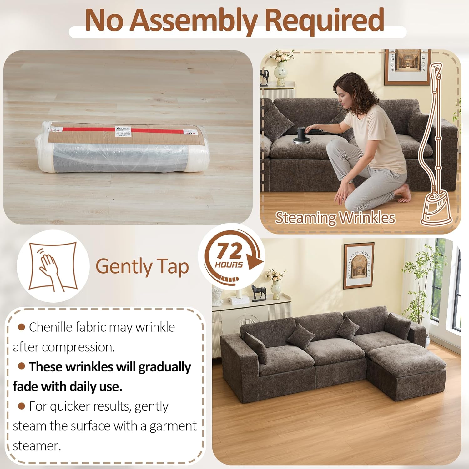 No Tools, No HassleEnjoy a stress-free setup with our fully compressed packaging. Simply remove the plastic wrap, and the sofa will naturally expand back to shape within 4872 hours. No installation or tools requiredperfect for effortless home setup.