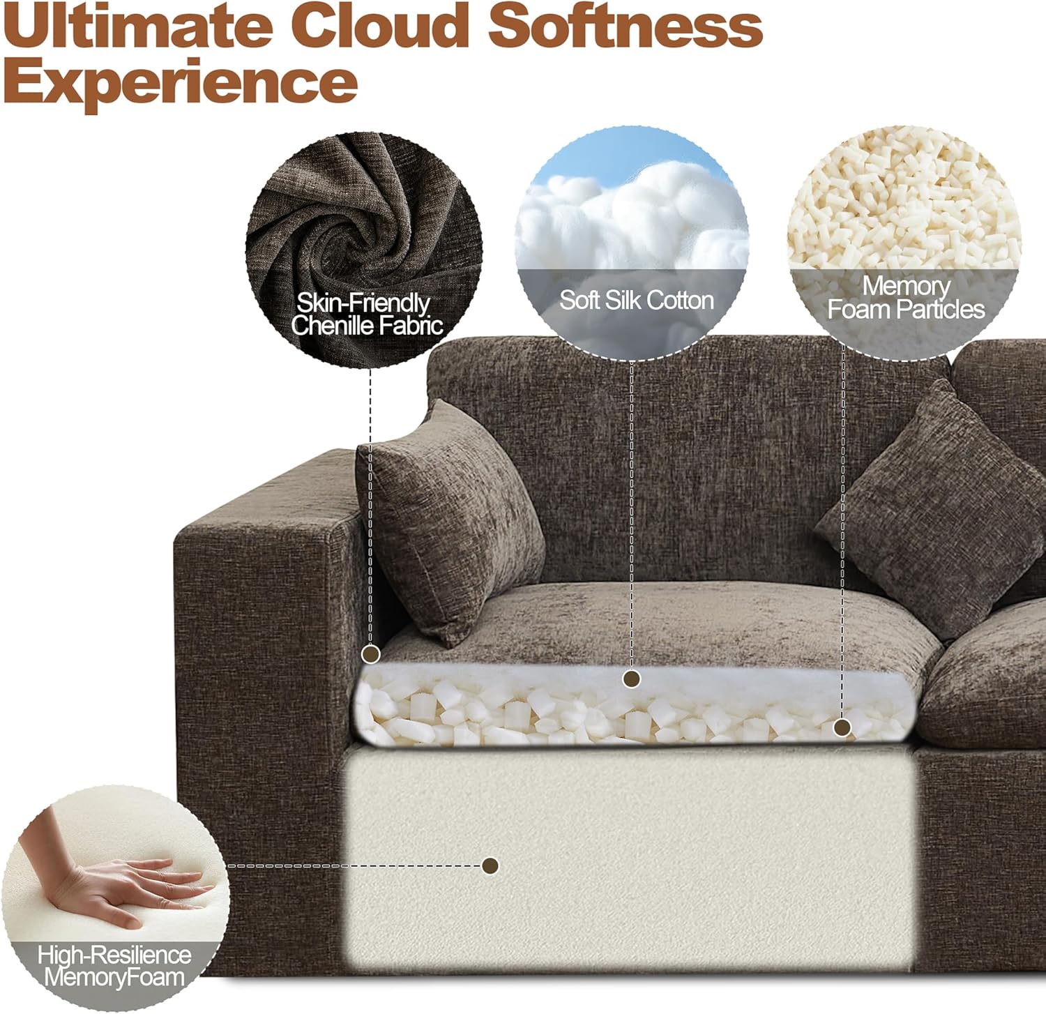 Cloud-Like ComfortEach cushion and pillow is filled with a soft blend of memory foam chunks and silk cotton for a cloud-like feel. Beneath the seat, a full block of 30D high-resilience memory foam provides strong, durable supportensuring the sofa keeps its shape and offers stable comfort over time.