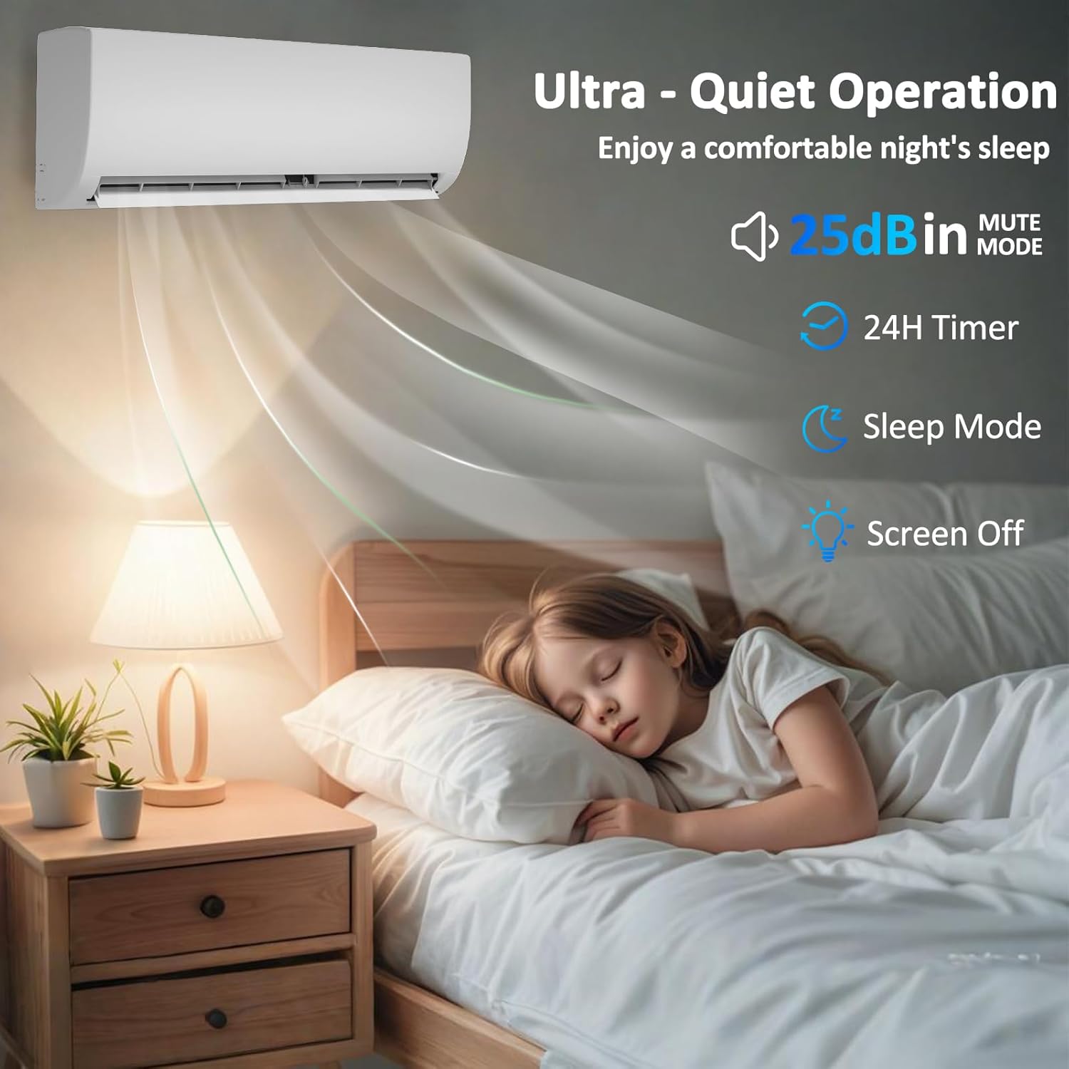 Smart Remote Control & Quiet Operation: Take control of your comfort with our smart remote. The user - friendly remote enables you to control this mini split AC unit from your bed or sofa conveniently. With smart 0.5-24h timer, you can customize when it runs/stops, saving energy. Its ultra - quiet operation ensures peaceful sleep, and the remote's display auto - shuts off after 10s of inactivity, which will not disturb your sleep.