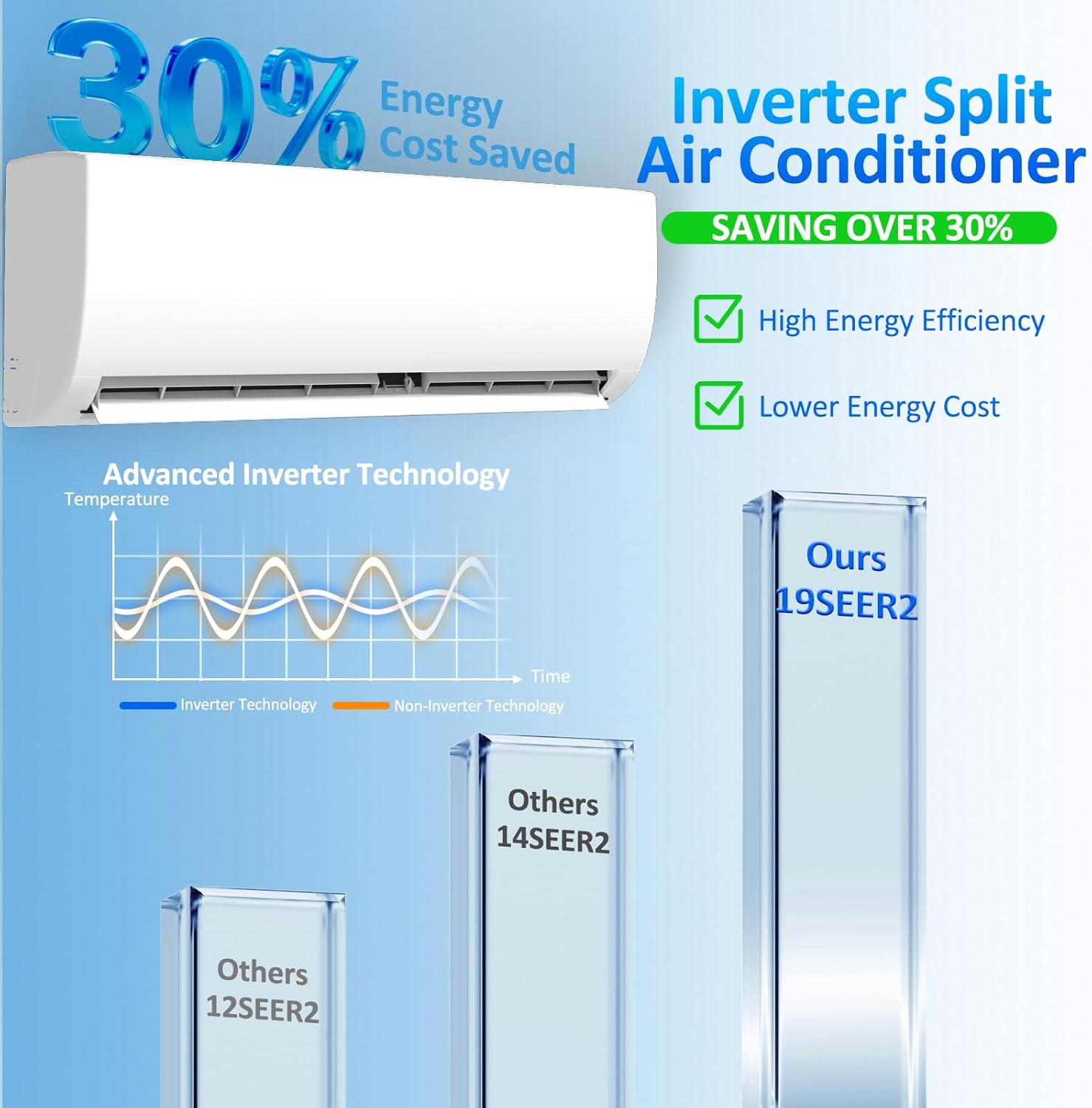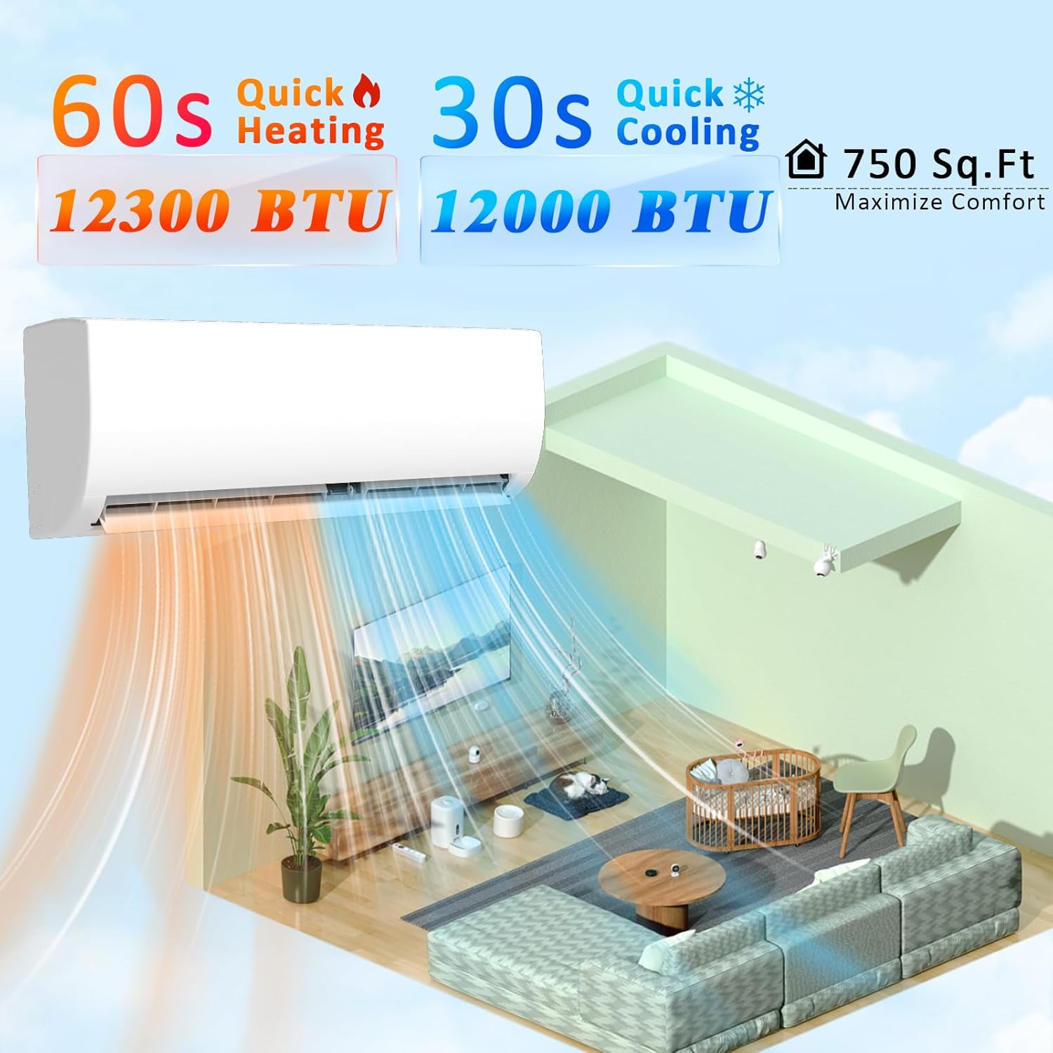 Stylish & Functional Mini Split AC: Efficiently manage your climate with our 12,000 BTU mini split system, powered by advanced inverter technology. It is designed to cool and heat spaces with an area of approximately 750 sq ft (Note: Actual performance may vary based on room insulation, ceiling height, and local climate). Its sleek design delivers powerful performance without compromising aesthetics, making it ideal for bedrooms, living rooms, offices, and other residential or light commercial spaces.