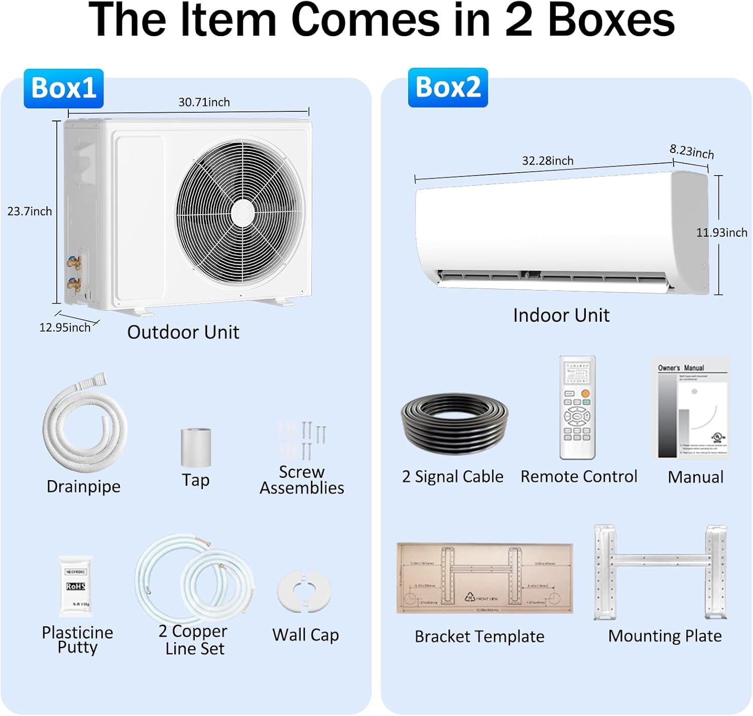 Installation Flexibility: Packages include indoor air handler, outdoor condenser, remote control, and installation kit; supports wall mounting with detailed instructions. Note: Your order is shipped in two separate boxes for safety and may arrive at different times. Please track both shipments and ensure you receive all packages. Feel free to contact our support team for prompt assistance if encountering any problems.