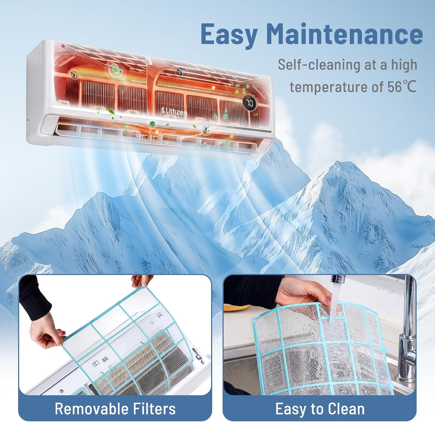 Quiet Operation & Easy Care: With a noise level as low as 23 dB and display off function, this mini split air conditioner and heater system ensures you enjoy undisturbed rest. The self-cleaning at a high temperature of 56/133 maintains air quality, while the removable and washable filters make upkeep hassle-free. Note: the professional installation is required.