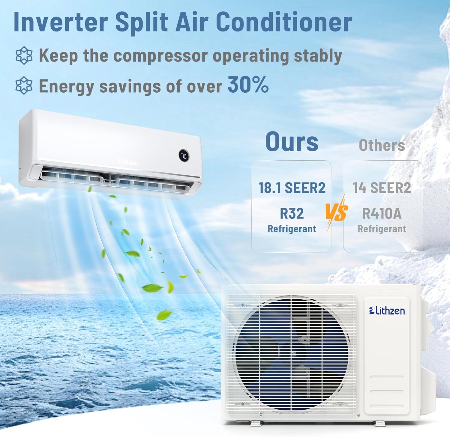 Superior Energy Efficiency: The advanced inverter technology keeps the compressor operating stably and provides energy savings of over 30%. In addition, this 18.1 SEER2 air conditioner uses R32 refrigerant, which has a lower environmental impact than R410A refrigerant.