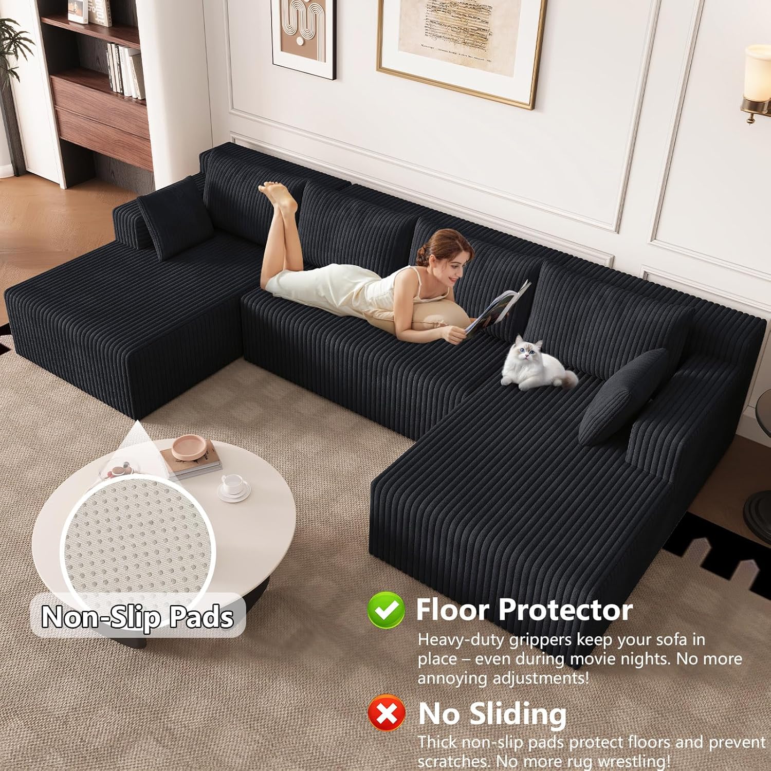 Luxurious Corduroy Upholstery: Sink into luxury with our premium corduroy fabric, designed for softness, breathability, and long-lasting durability. This skin-friendly material provides a comfortable seating experience while adding an elegant touch to your dcor. The boneless sofa includes 4 large cushions and 2 throw pillows, enhancing both comfort and the longevity of your furniture. A perfect blend of modern style and functional comfort for any home