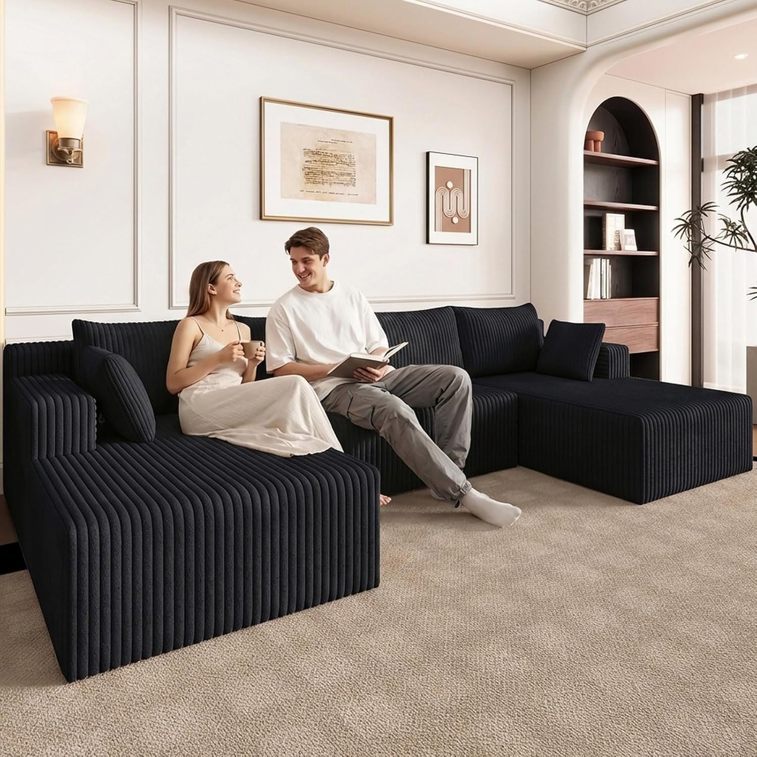 Luxurious Corduroy Upholstery: Sink into luxury with our premium corduroy fabric, designed for softness, breathability, and long-lasting durability. This skin-friendly material provides a comfortable seating experience while adding an elegant touch to your dcor. The boneless sofa includes 4 large cushions and 2 throw pillows, enhancing both comfort and the longevity of your furniture. A perfect blend of modern style and functional comfort for any home