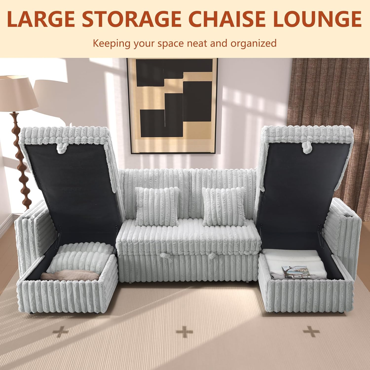 Sectional Couch with Storage Chaise: This U shaped modular sectional sofa is equipped with storage space at the bottom and side of the sofa for you to organize your space. You can store blankets, pillows, toys, your daily necessities in a hidden place to save space and keep the space neat and tidy.