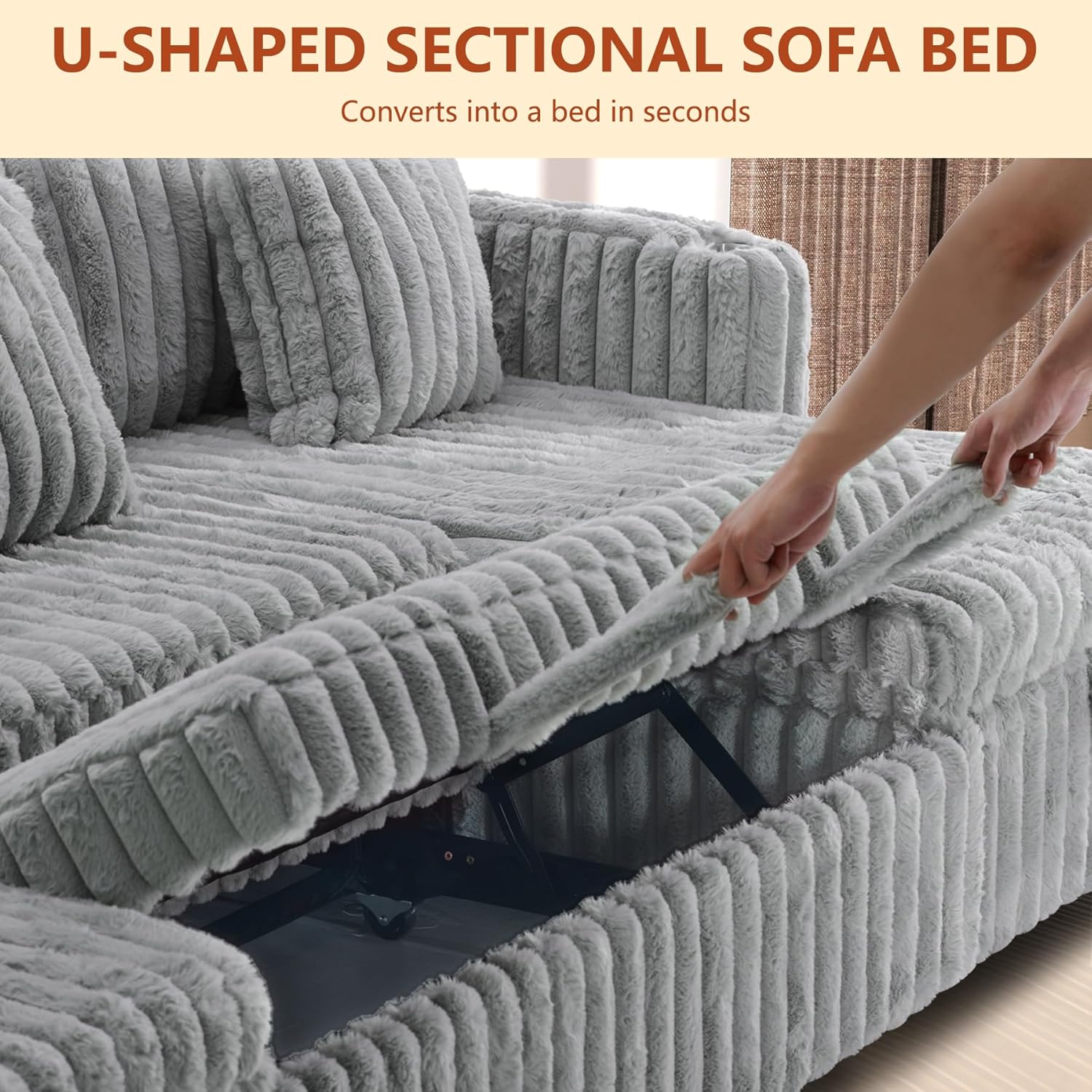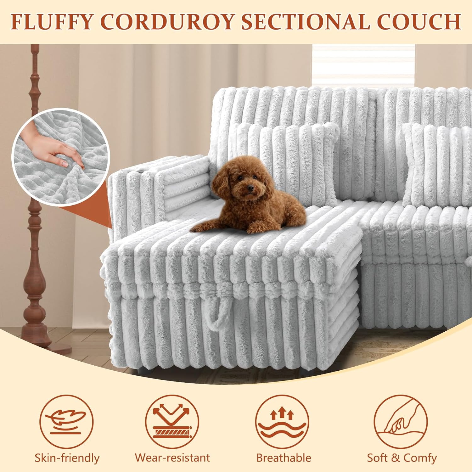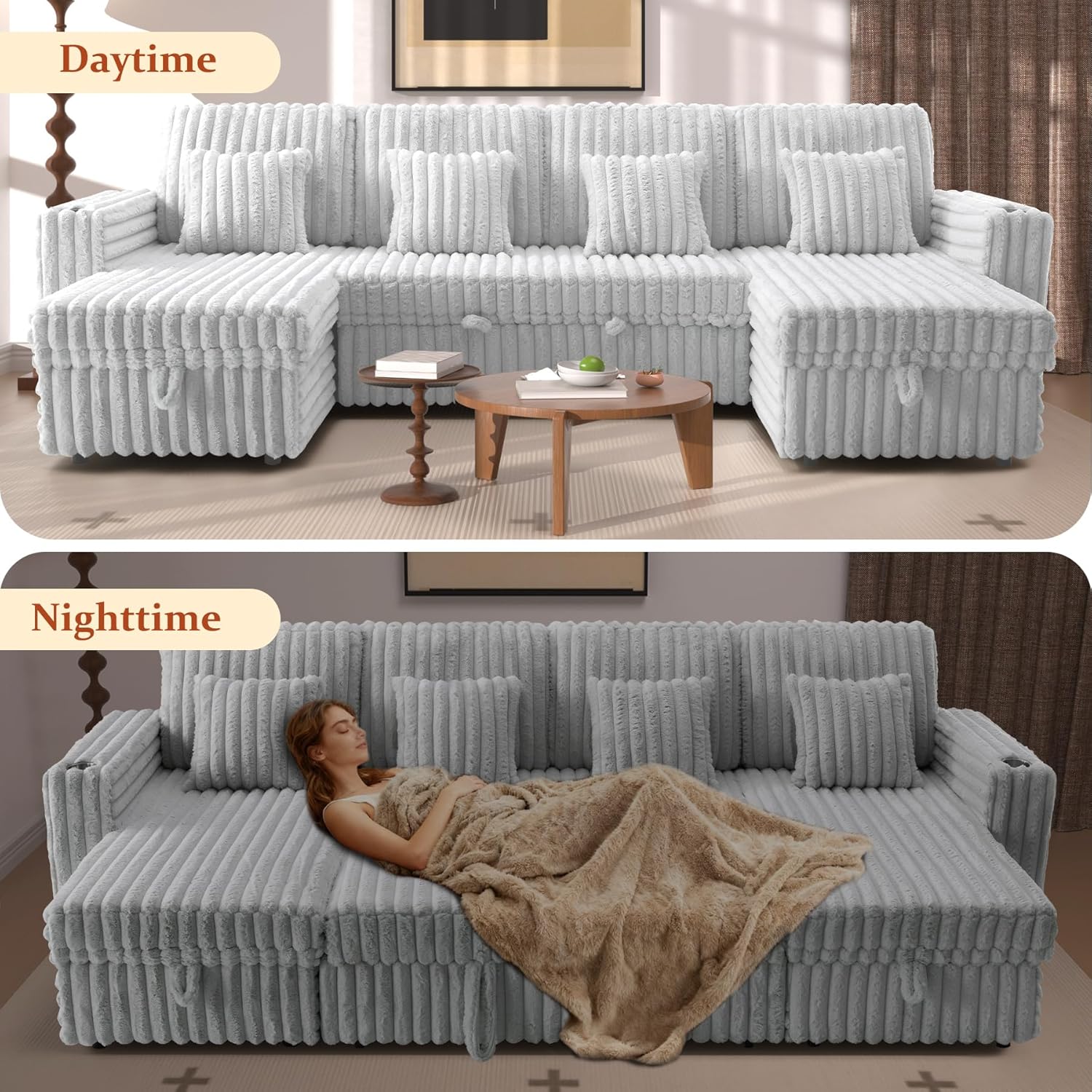 Premium Coduroy Fabric: Our 124" sectional sleeper couch features pet friendly corduroy fabric which offers a soft & silky touch. This sleeper sofa bed is designed with thick high resilience foam backrests & cushions for ultimate relaxation and comfortable seating experience. We have a variety of colors and Sizes for option to meet different decoration styles