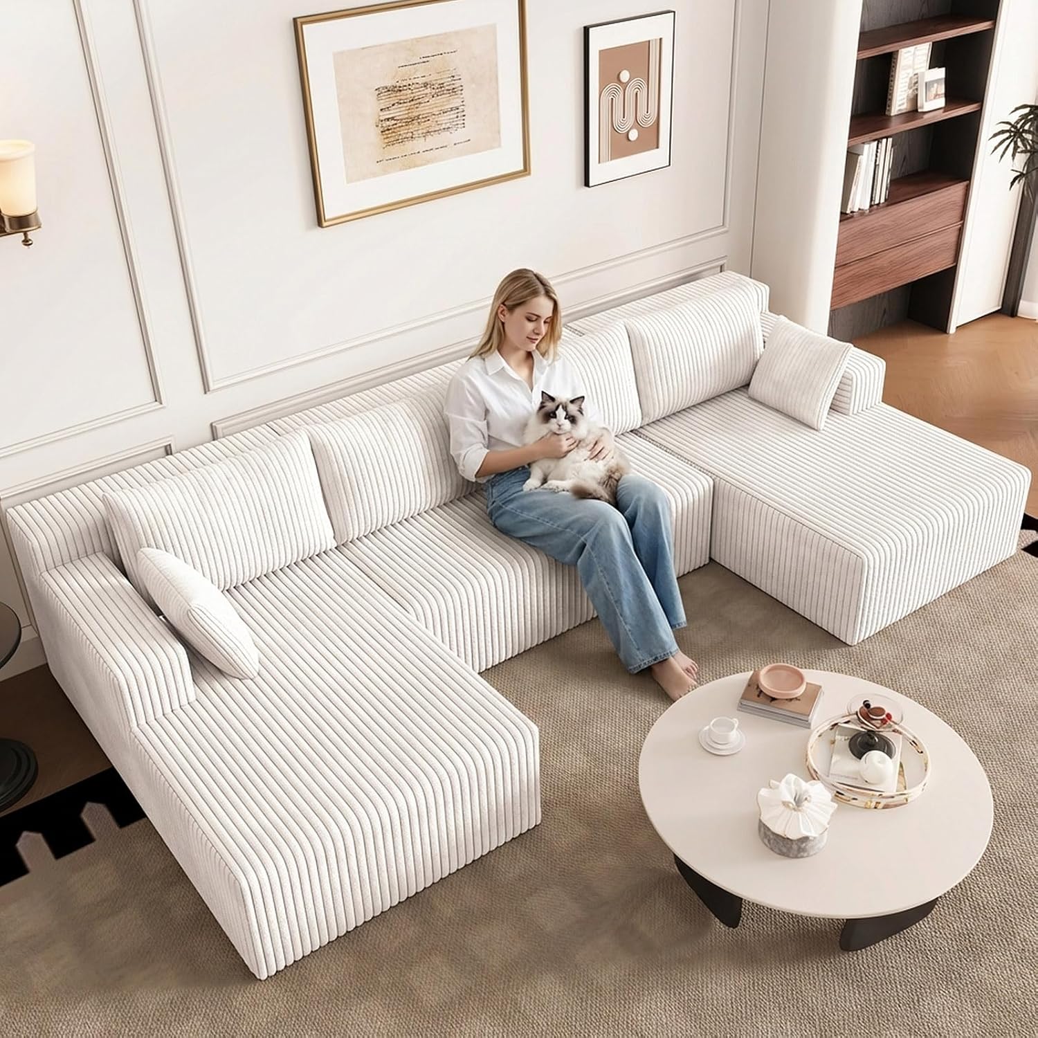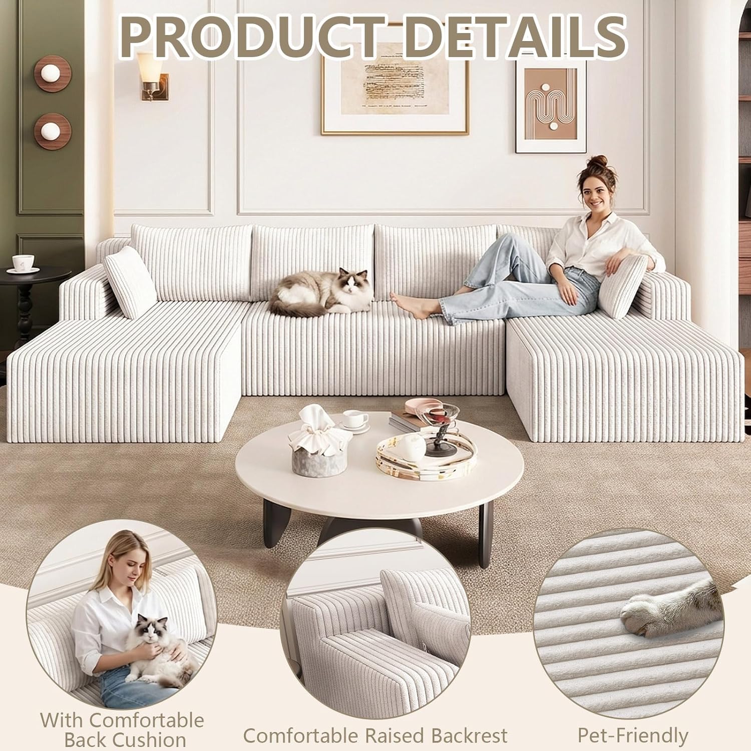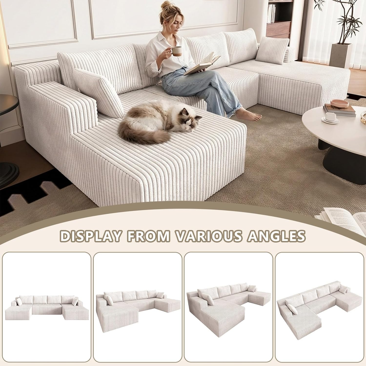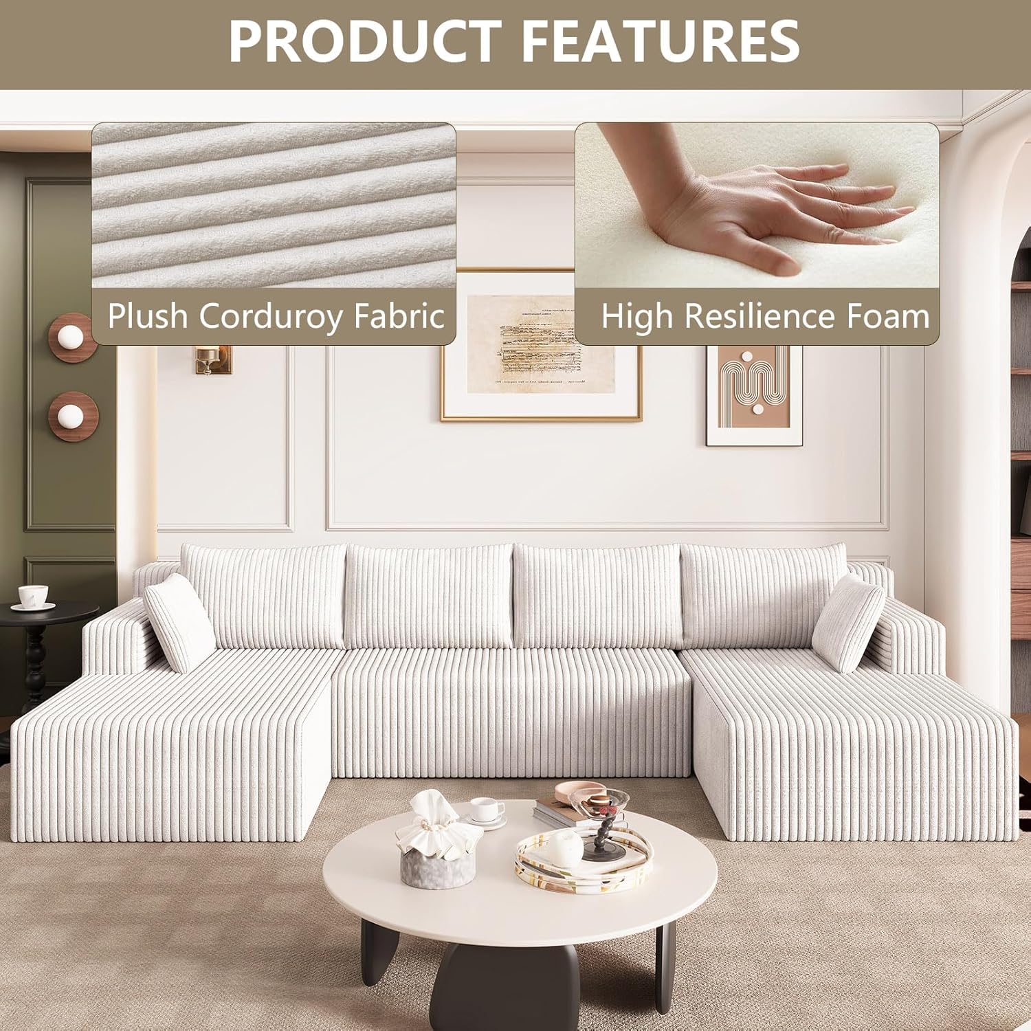 ERGONOMIC SUPPORT: This u shaped sectional couch is filled with high resilience sponge, providing a cloud like comfortable experience. The ergonomic design, combined with the backrest pillow, provides ample support for your back and body, bringing unparalleled comfort experience. Whether it's taking a nap, reading, or relaxing all day long, it's your ideal choice