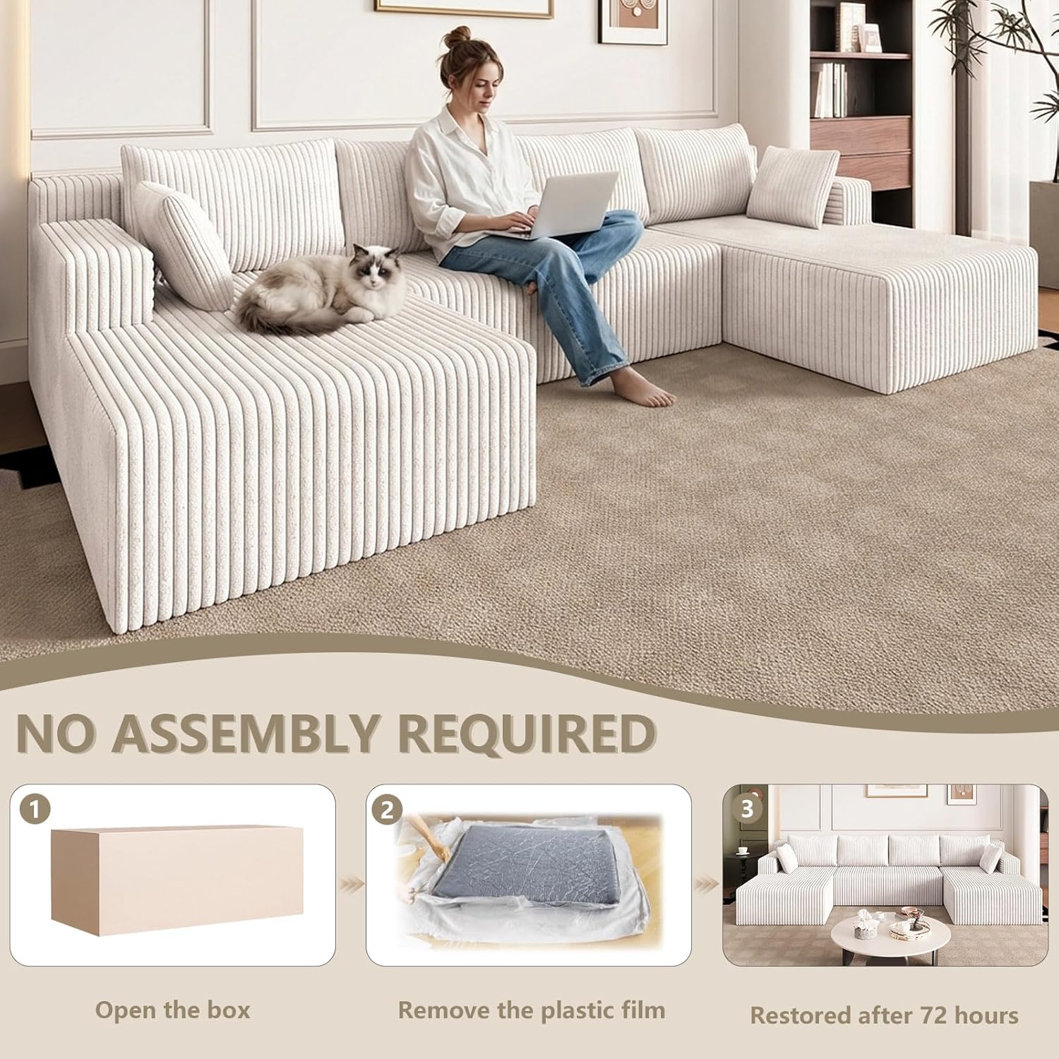NO ASSEMBLY REQUIRED: This sectional sofa is ready to use straight out of the box, with no complicated assembly needed. Simply unpack it, gently fluff it up, and it will regain its shape. Full recovery takes approximately 48-72 hours. Please note that due to logistics limitations, your order may be divided into more than one package, they may be delivered at different times. So when you only receive a part of the sofa, please don't worry and patiently wait for the delivery of other packages