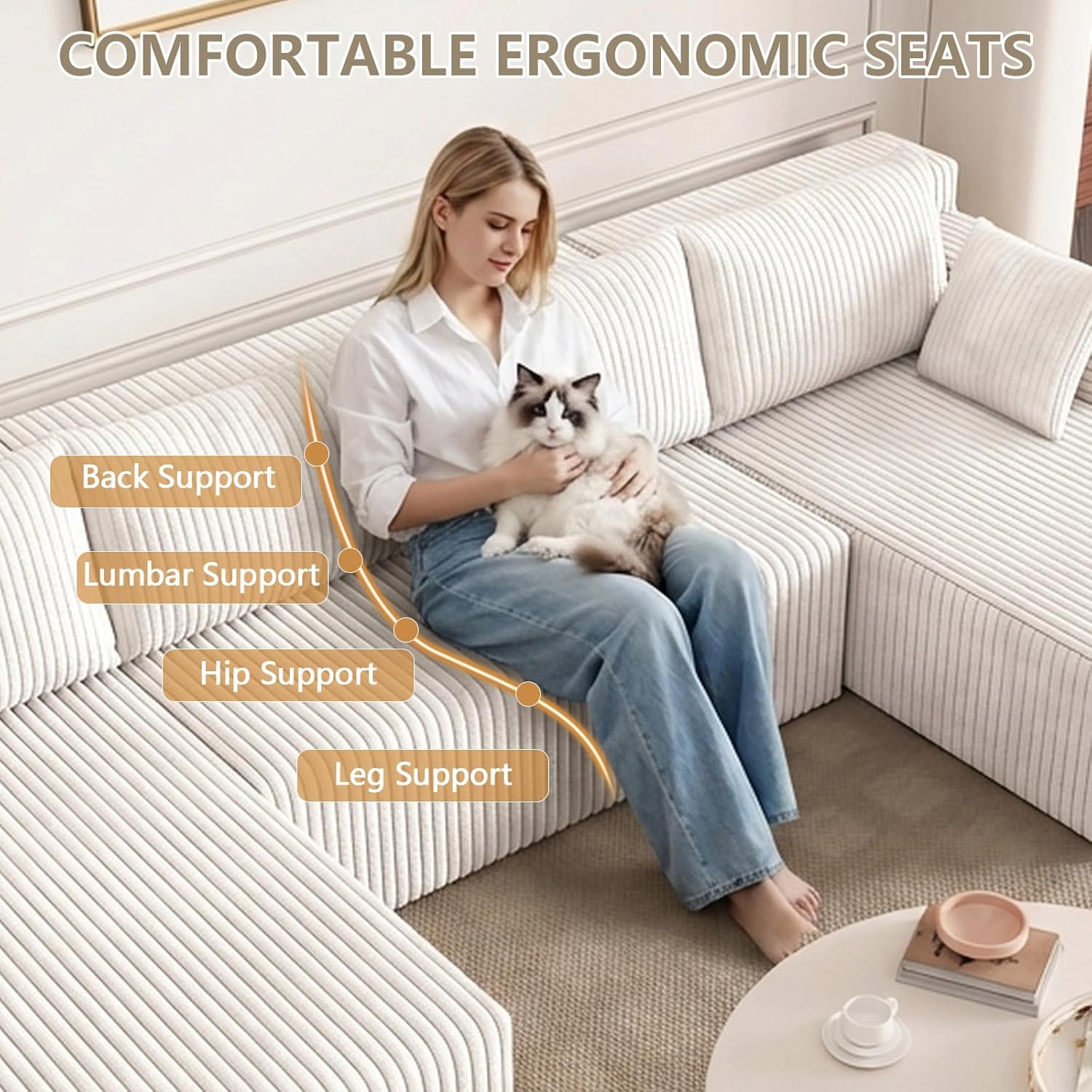 SOFT CORDUROY FABRIC: This cloud couch sectional is made of high-quality corduroy fabric, perfectly combining luxurious and soft touch with comfort, while presenting an elegant texture. The exquisite striped texture design adds warmth and fashion to the sofa. It brings a cloud like comfortable touch, while also being breathable and easy to maintain
