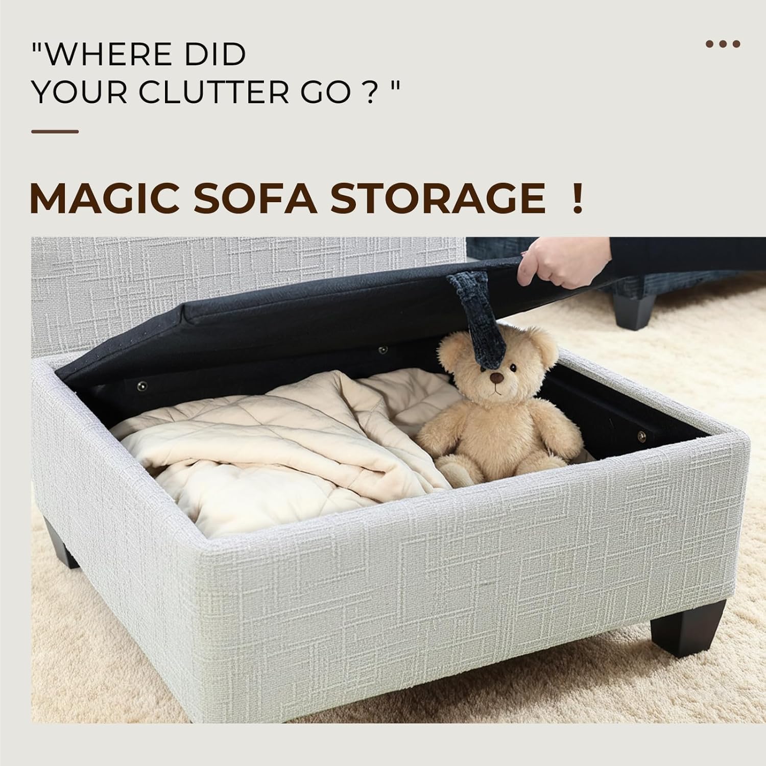4. Innovative All-Seat Storage Compartments Each seat includes a versatile 26"x26"x8" hidden storage compartmentperfect for stowing blankets, pillows, or toys. The movable ottoman adds flexible leg support or extra seating, maximizing functionality in your living space.