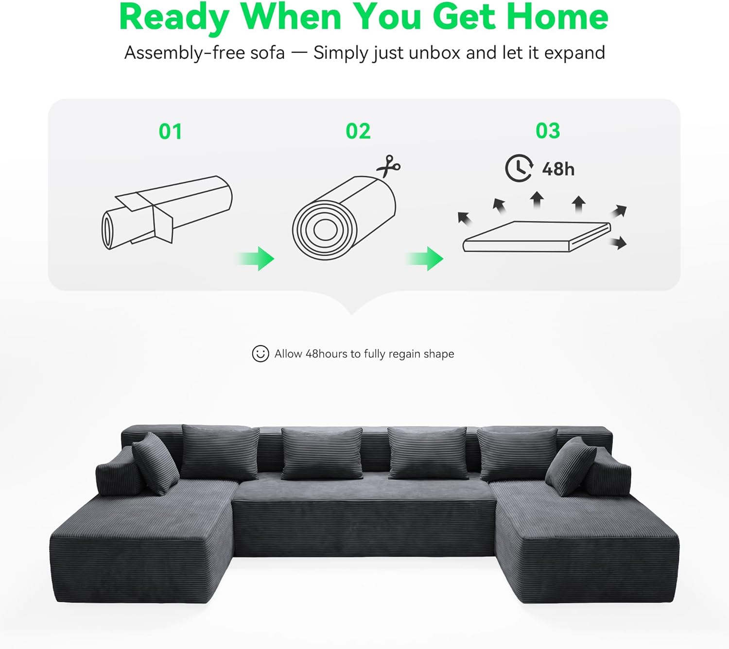 NO ASSEMBLY, READY TO USEThis boneless couch arrives compressed in three packages and requires no assemblysimply unbox and allow it to expand naturally. Designed for convenience and stability, this sectional sofa includes an anti-slip base to keep each module securely in place