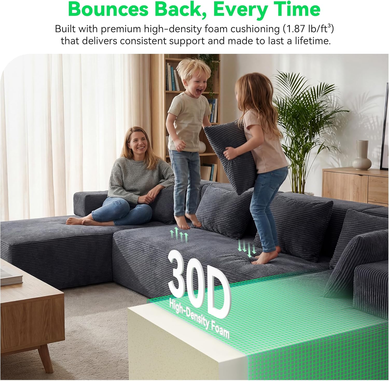LONG-LASTING SUPPORT, NO SAGGINGBuilt with high-resilience premium foam, this sectional sofa maintains its shape through up to 100,000 sit-and-rise cycles. Compared to spring-based designs, sectional couches for living room like this provide consistent support with no sagging and no slow rebound over time