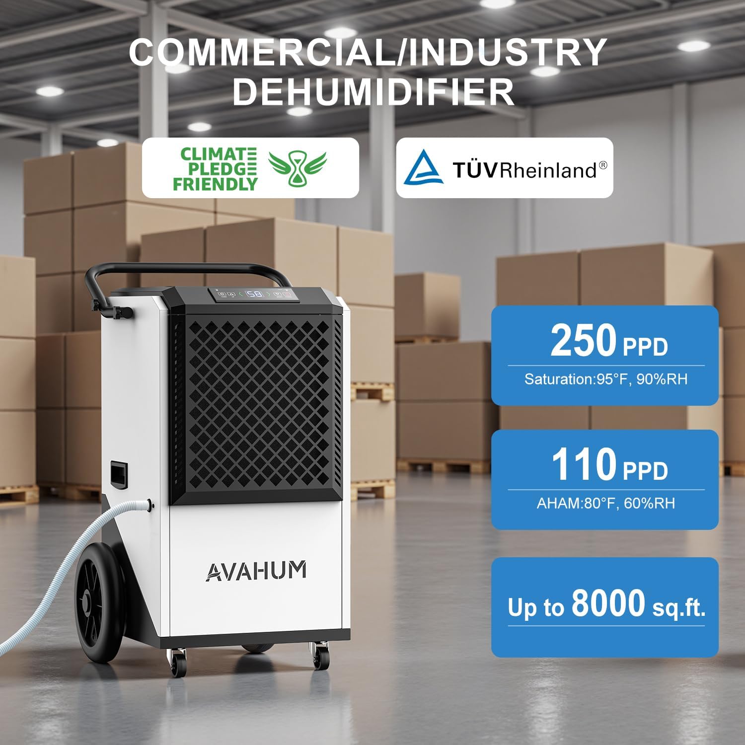 HEAVY-DUTY DESIGN WITH WASHABLE FILTER Constructed with durable housing, ergonomic handle, and heavy-duty wheels for easy mobility. Includes removable MERV-1 washable filter for simple maintenance and improved airflow efficiency. Designed for long-term industrial humidity control with dependable performance.