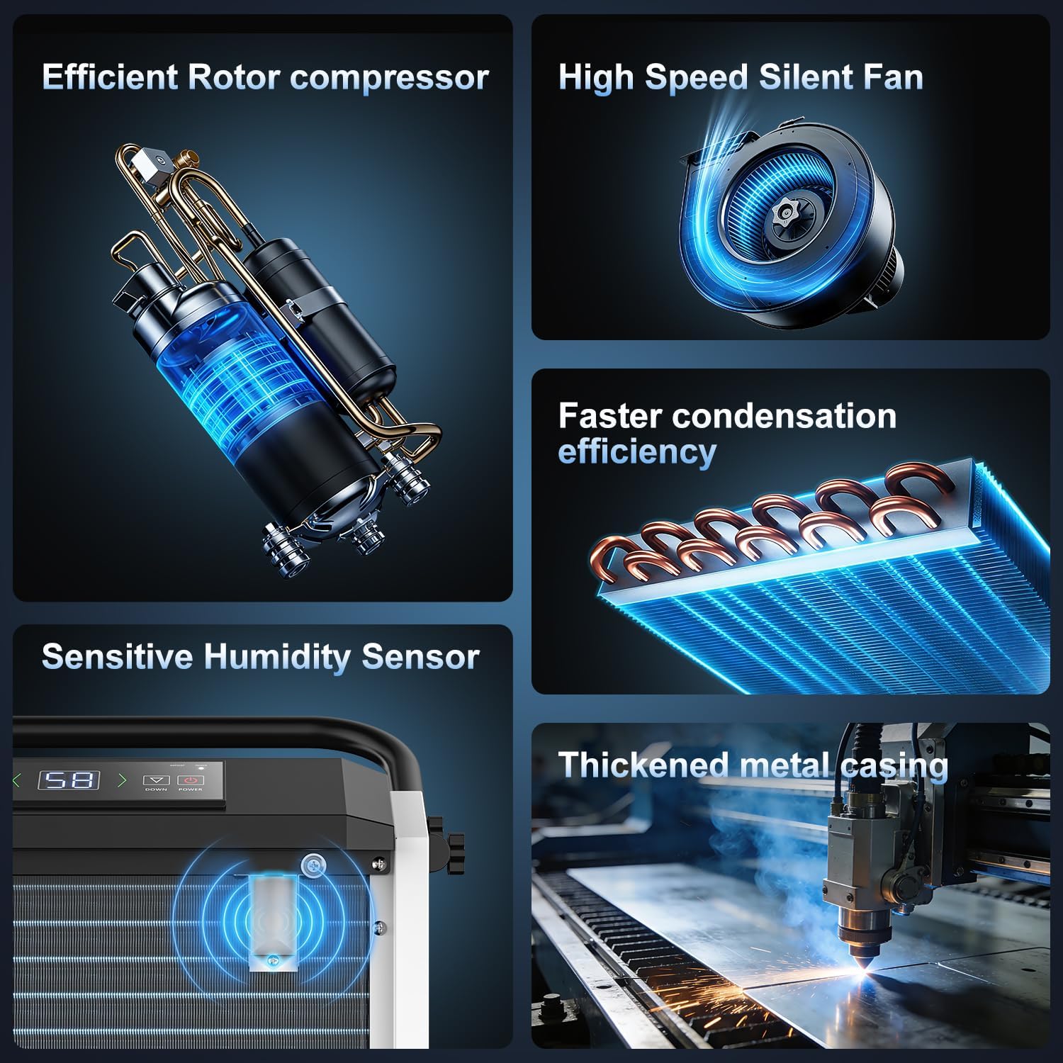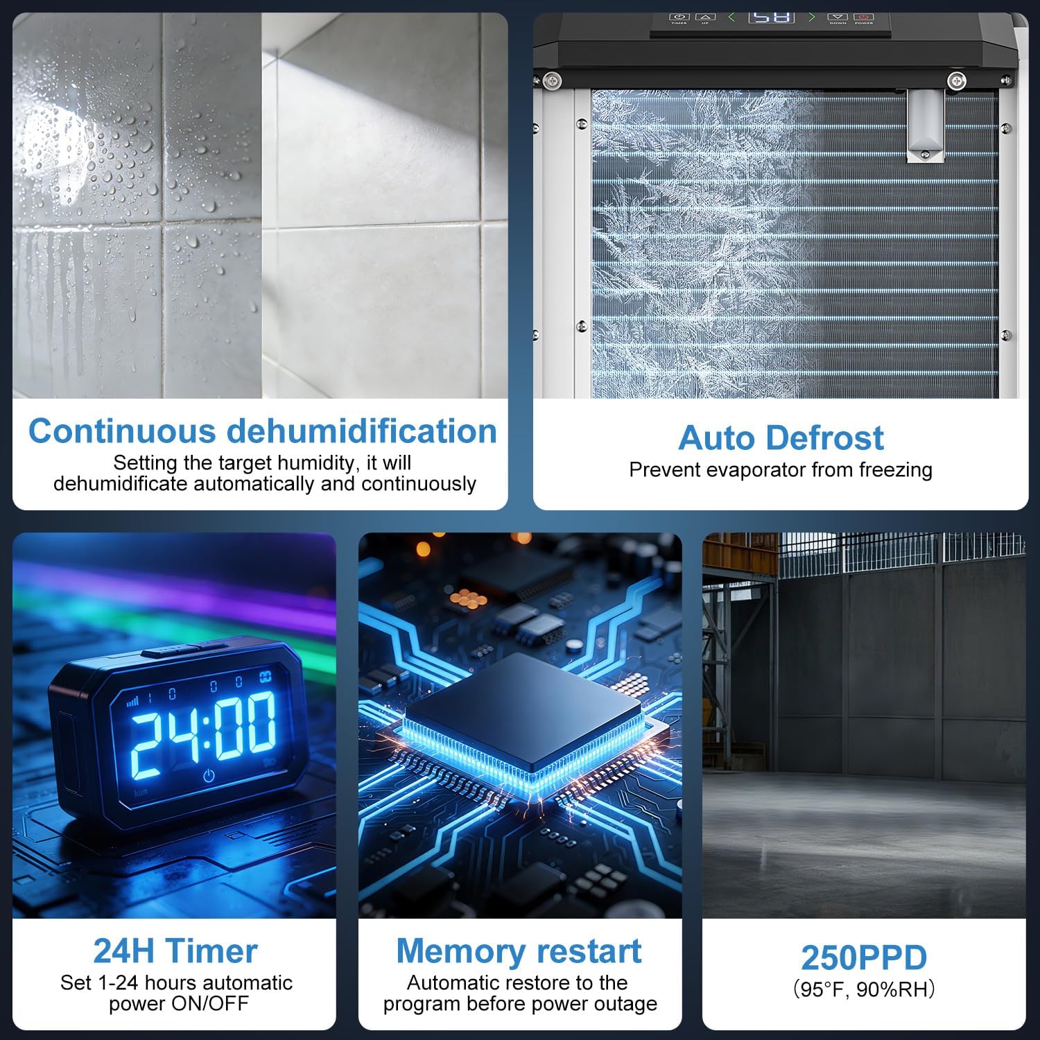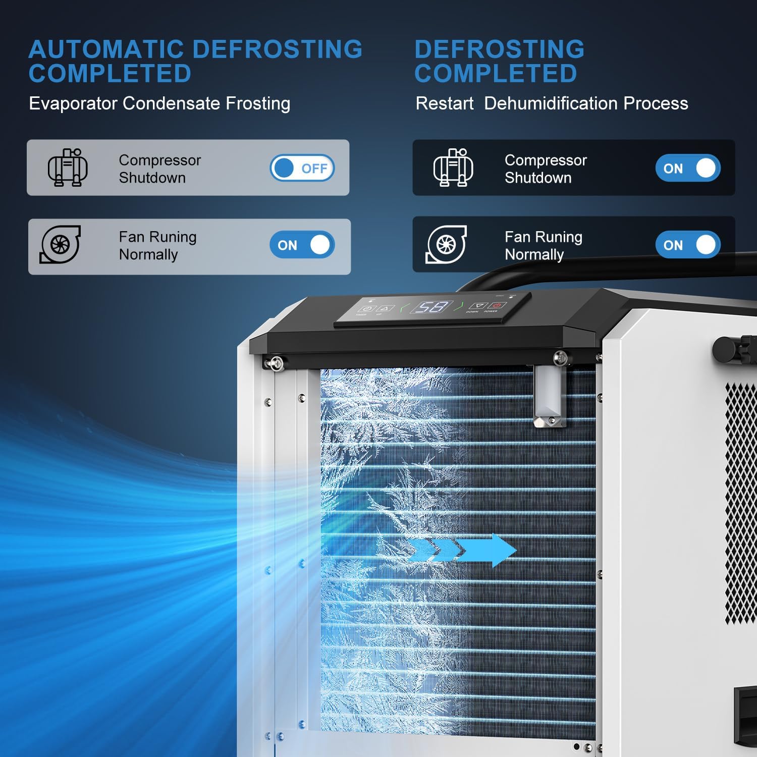 AUTO DEFROST AND LOW-TEMPERATURE CONTINUOUS DRYING Built-in automatic defrost system prevents frost buildup on coils, allowing stable operation in temperatures as low as 41F. Continuous defrost design and overheat protection ensure reliable performance in warehouses, storage facilities, and job sites.