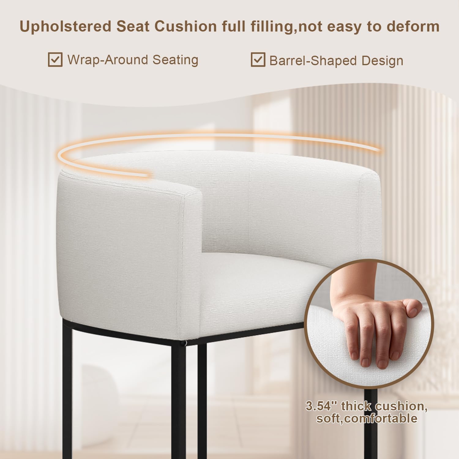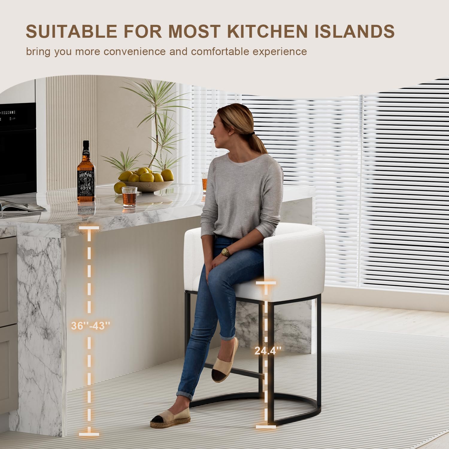 Applicable Height Recommendations:This mid-century modern comfortable bar stool has a 32.87"Hx 22.2"W x 18.9"D and comes with pre-assembled pads to protect your floor from scratches. If you want to put bar stools into the desktop, the desktop must be taller than 32 inches. Seat height: 26"H. Suitable for 36-42" height kitchen island. The barstool kindly confirm the island's height and dimension picture before purchasing.