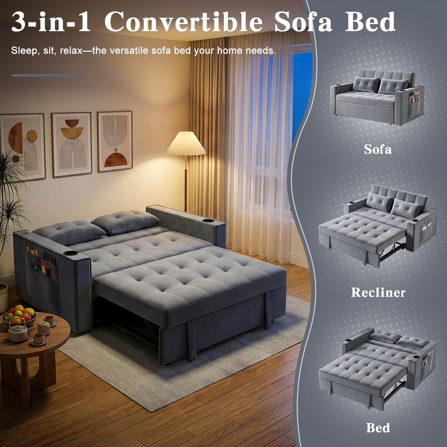 • 3-in-1 Pull Out Sofa Bed with Charging Station, Cup Holder & Side Storage - 70" Multi-Functional Recliner Sofa Bed for Home Living Room Grey 2