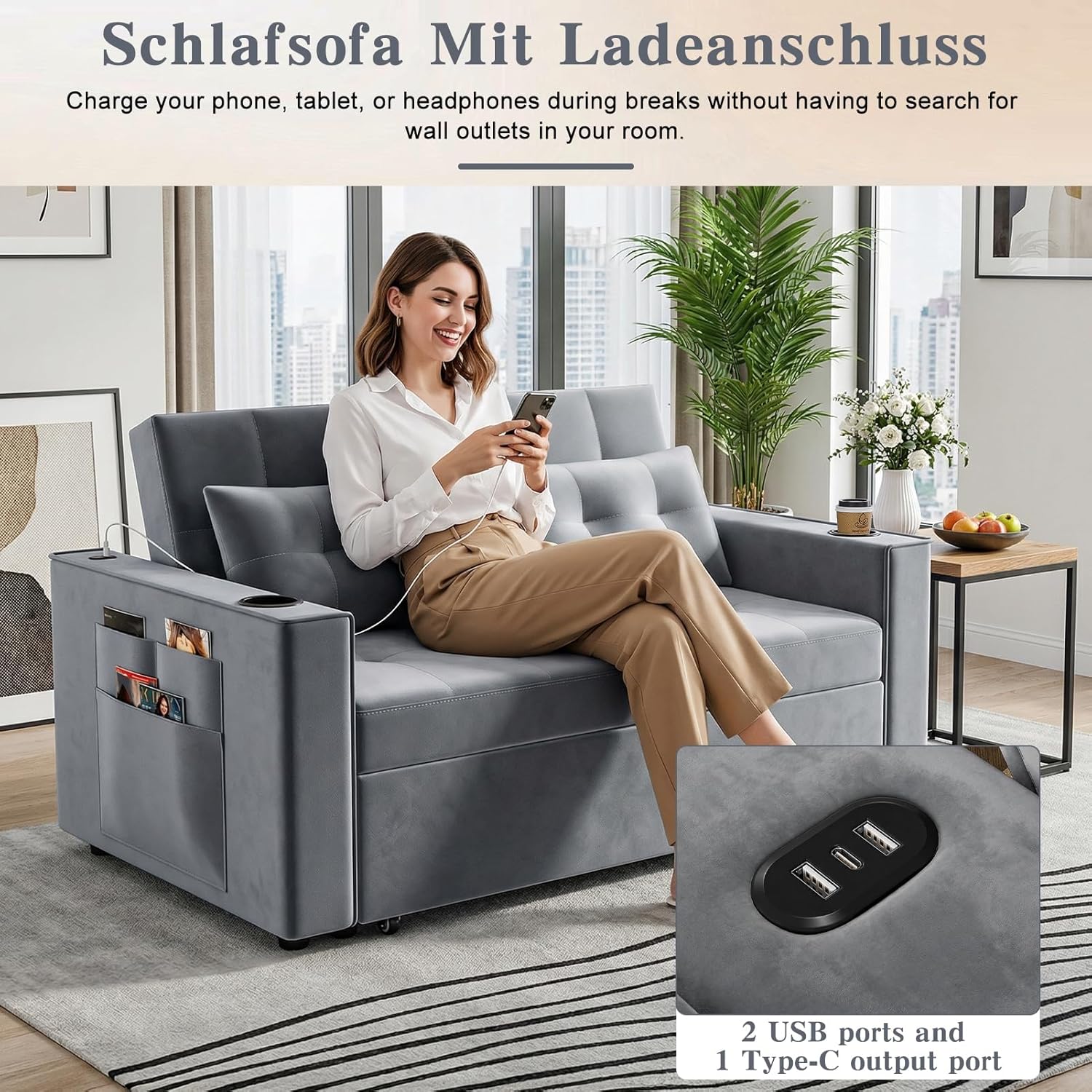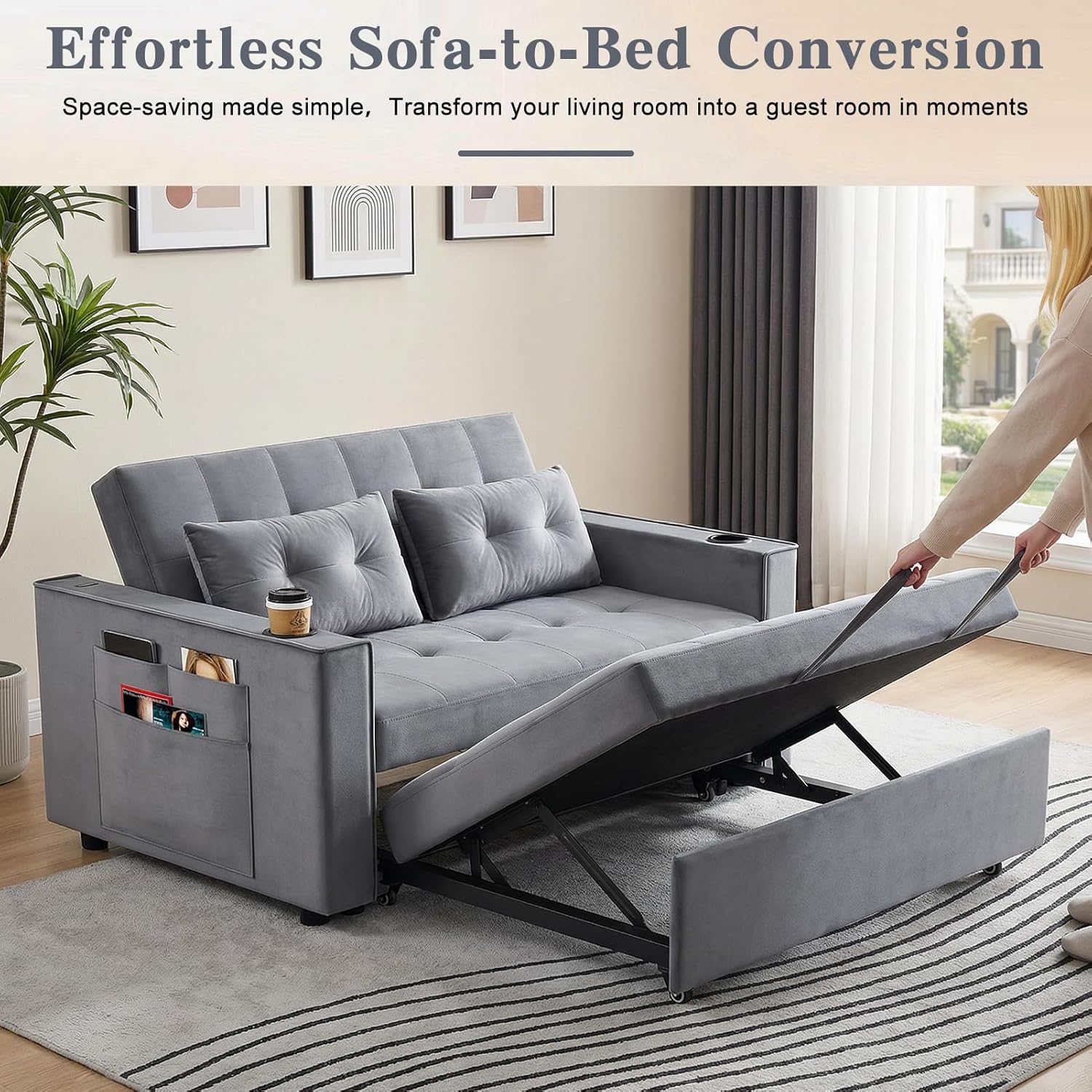 Storage Pockets- Built-in Charging Station Design: With side storage pockets, this sleeper sofa and convertible sofa helps to keep everything you need all in one place.Large side pockets can store your cell phone, remote control, magazines, newspapers, etc, making storage simple and easy.USB/Type-C ports for multiple devices; cup holder prevents spills.