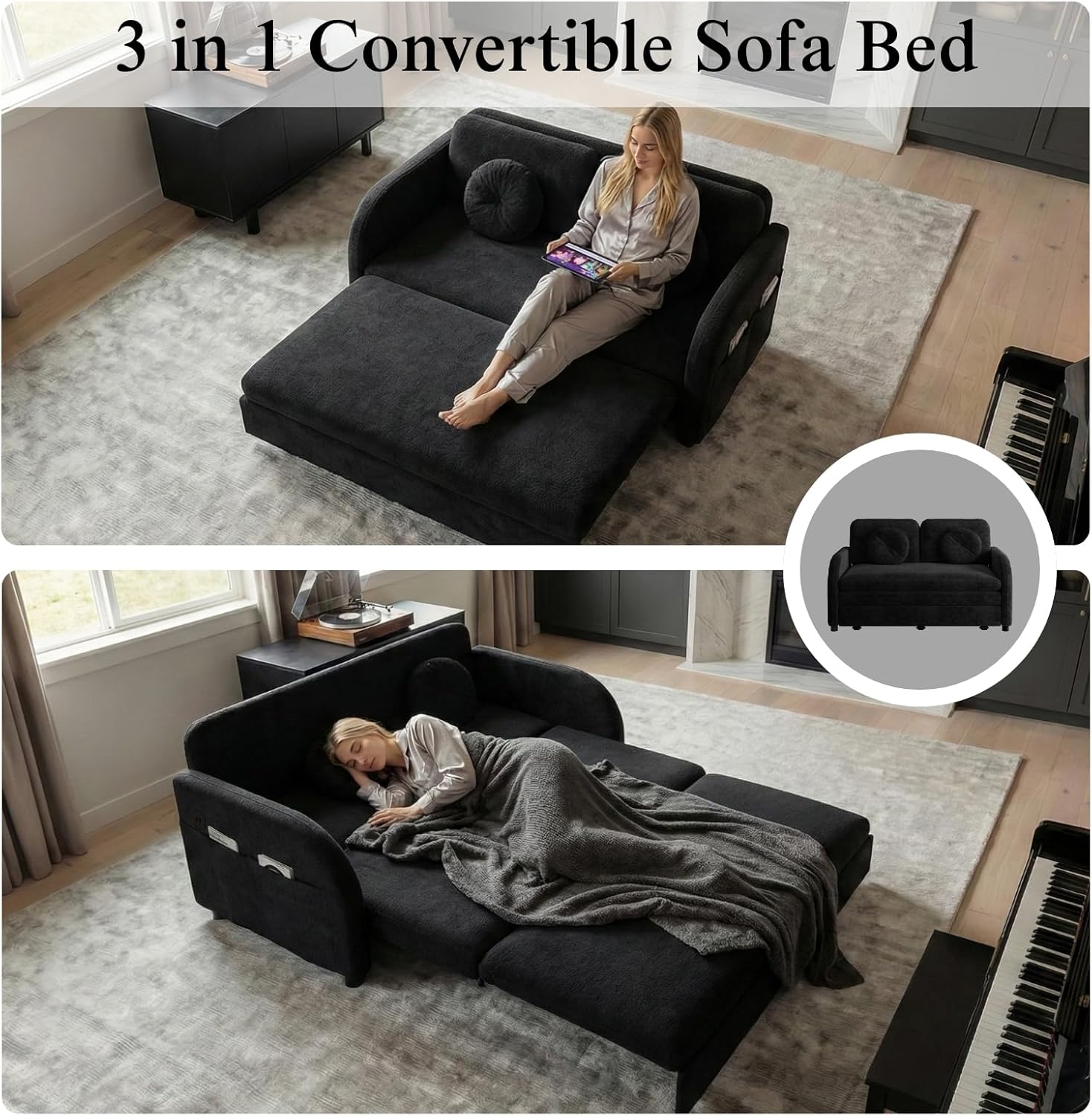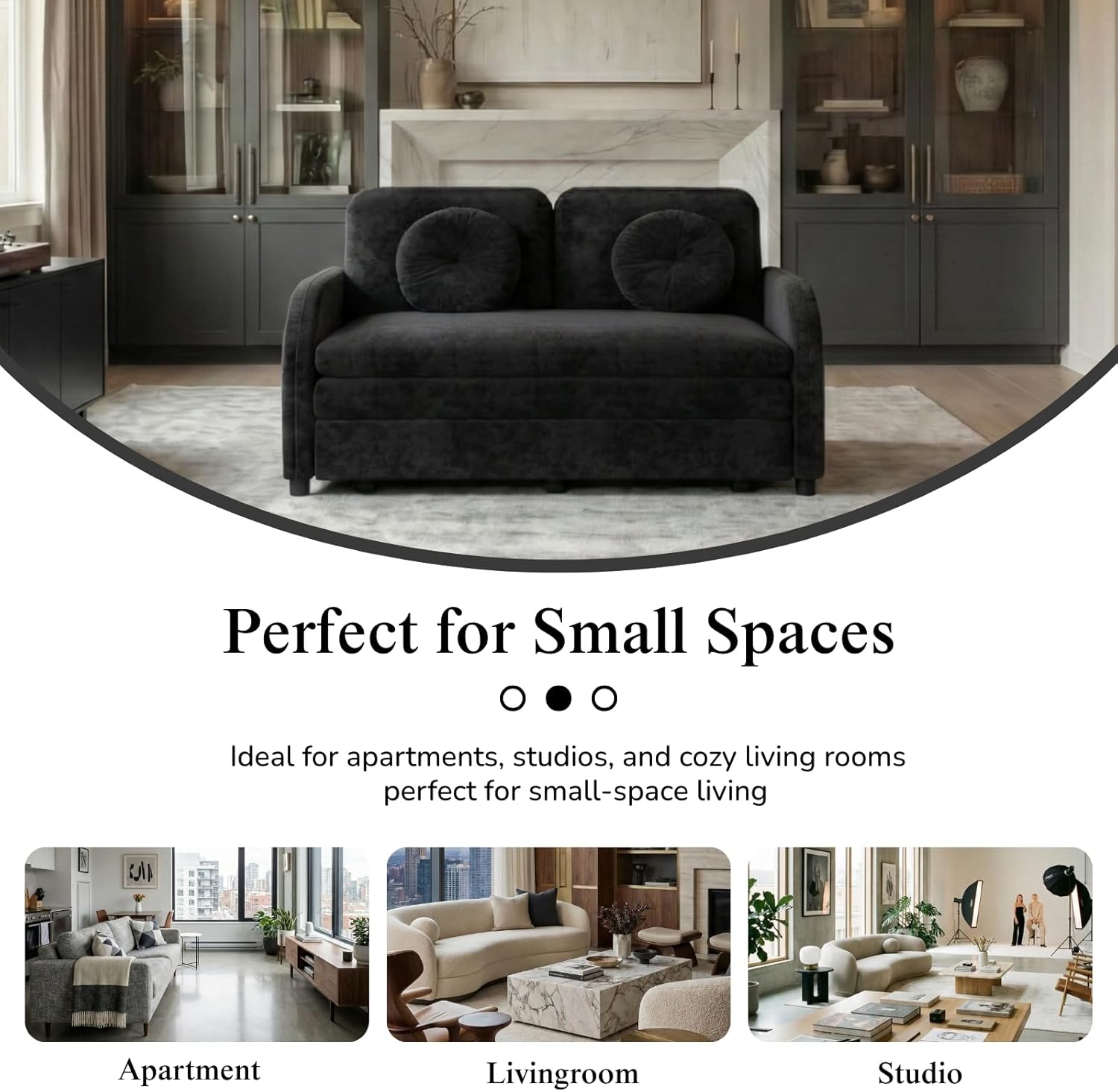 Space-Saving Design with Side Storage Pockets. Designed for small spaces, this compact sleeper sofa includes side pockets for remotes, magazines, or bookskeeping your space neat and organized.