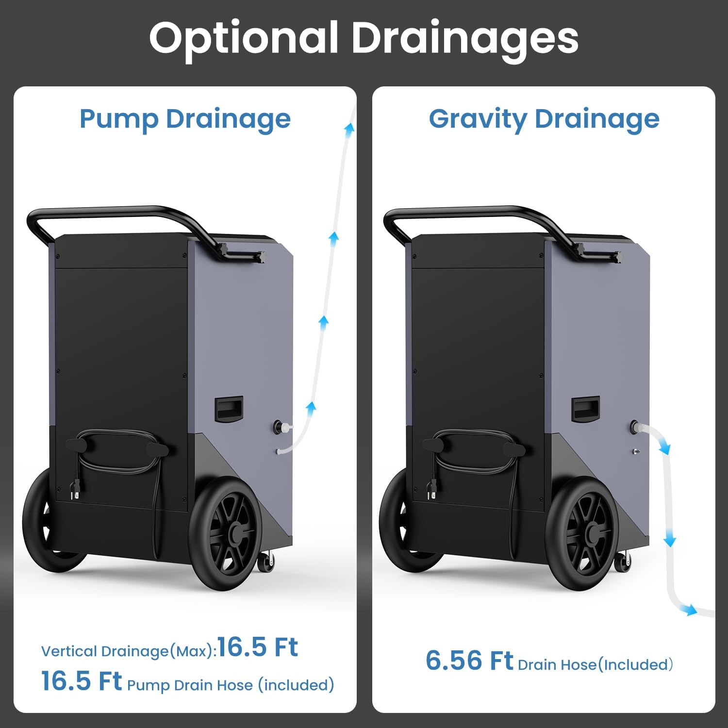 CONTINUOUS DRAINING WITH EXTERNAL PUMP OPTION Built with a gravity drainage port and drain hose for uninterrupted operation. While this model does not include an internal pump, it is designed to work with an external condensate pump for upward drainage when necessary, offering adaptable installation for different job site conditions.