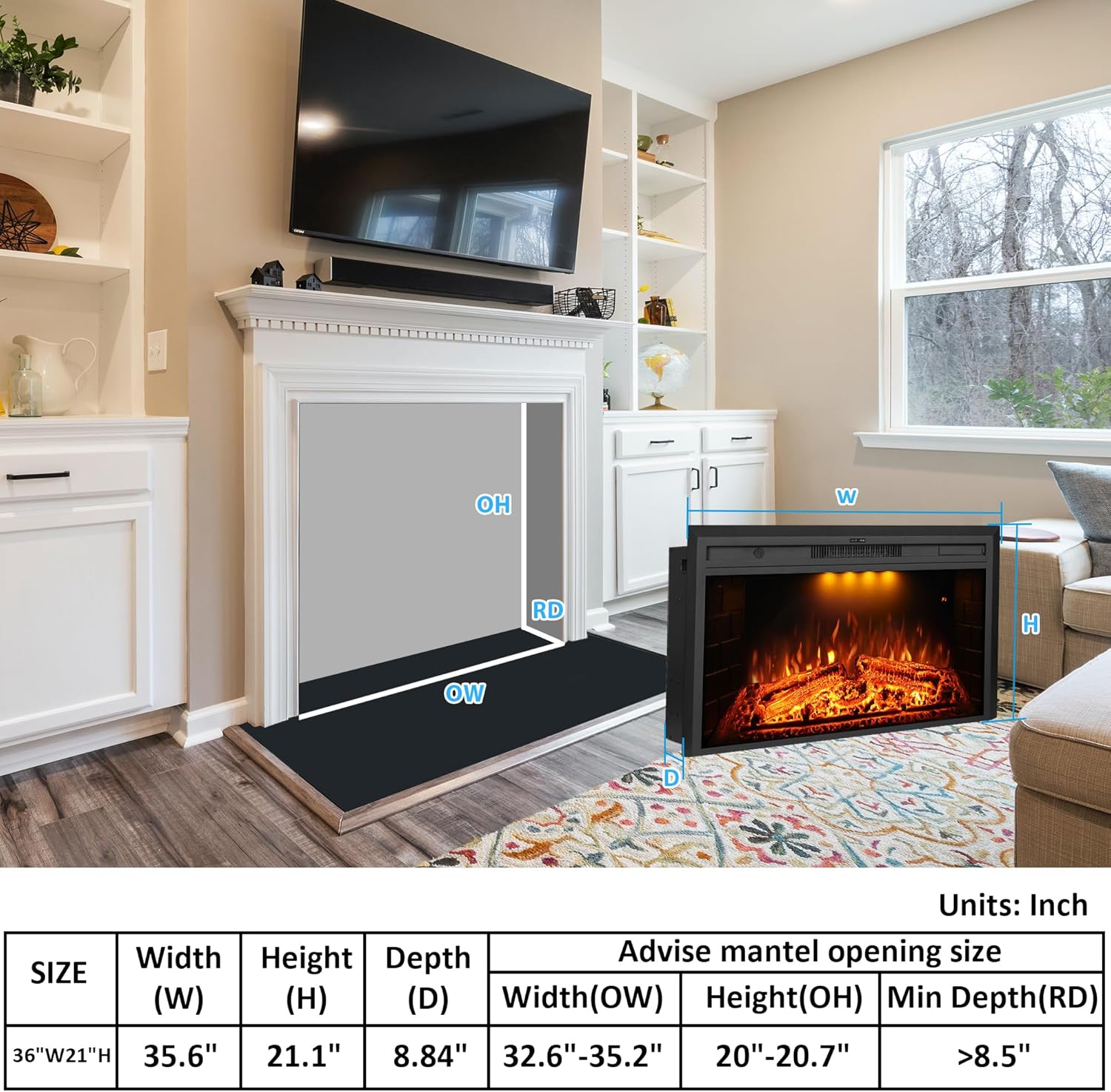 Insert Installation: This recessed electric fireplace could well match the mantel, TV stand, and existing wall opening or be a replacement heater for the electric fireplace. No assembly and easy installation, plug-in with 6ft power cable and use ONLY 110-120V 15Amp. Kindly refer to the advise opening size32.6"-32.7"(W) X 20.0"-20.1"(H) X 8.86"-9.06"(D). Please check the Instruction&Manual PDF as attached below.