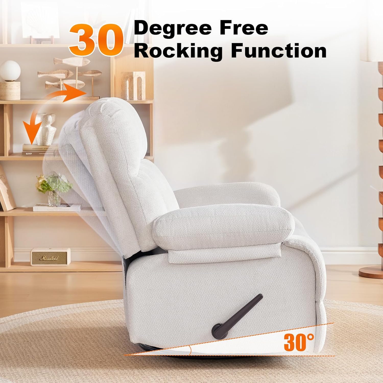FULL RANGE OF MOTION Stay energized even when you're resting. Our rocking recliner offer a full 360-degree swivel and 30-degree rocking, allowing you to easily turn in any direction to help eliminate stress and fatigue.